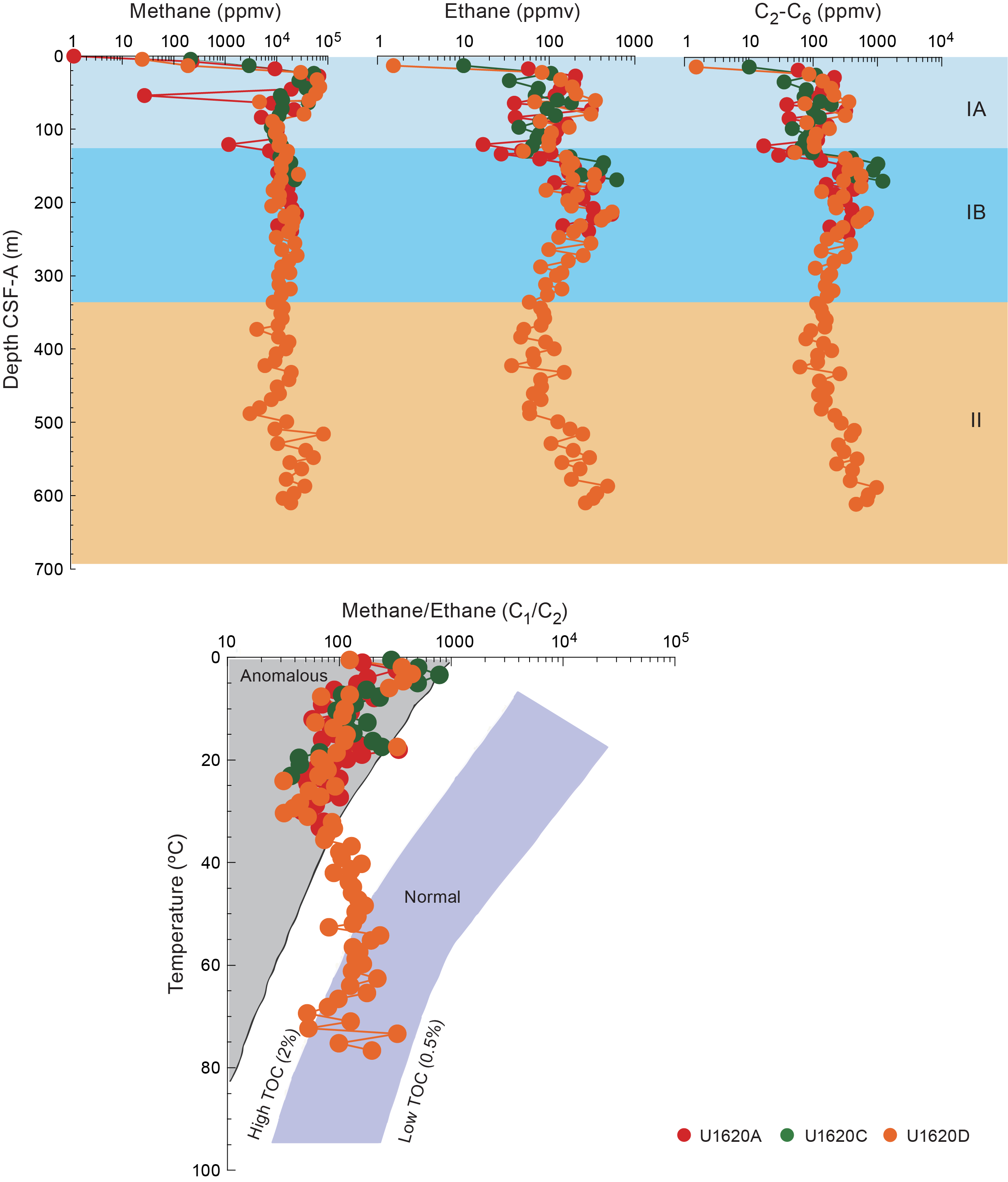 C1/C2+ ratios can suggest the origin of hydrocarbons. Generally, low C1/C2+ ratios indicate a nonbiogenic source (i.e., thermogenic or abiotic source of hydrocarbon gas; McCollom and Seewald, 2007). This implies that the high C2–C6 hydrocarbon intervals in Lithostratigraphic Subunit IB and Unit II are a result of the early low-temperature diagenesis of organic matter (a thermogenic source) or originate from abiotic processes, one candidate for which may be the serpentinization of ultramafic rocks that originated at the nearby ultraslow-spreading mid-ocean ridge (Johnson et al., 2015). In the latter case, hydrocarbons may have been advected to these layers in fluids sourced from depth.