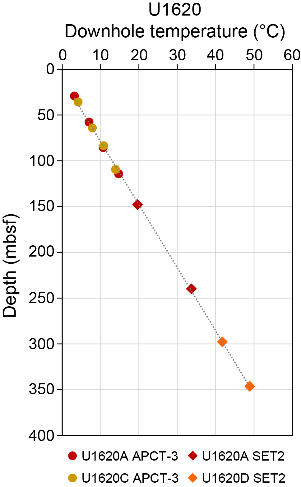 During APC coring in Holes U1620A and U1620C, in situ formation temperature was measured for every third core (403-U1620A-4H, 7H, 10H, 13H, 403-U1620C-4H, 7H, 10H, and 13H) using the APCT-3 tool. After switching to XCB coring in Holes U1620A and U1620D, in situ formation temperature was measured before Cores 403-U1620A-19X, 31X, 403-U1620D-38X, and 44X using the SET2 probe. The temperature increased almost linearly with depth, and the slope of linear regression provides a much higher geothermal gradient (145.3°C/km) than typical oceanic sediments compared with the statistical data set (Kolawole and Evenick, 2023) (Figure F49). The heat flow in the sediments and the temperature at the seafloor were calculated from the measured thermal conductivity in Cores 403-U1620A-1H through 31X and 403-U1620D-31X through 37X and the formation temperature measurements. Assuming a linear relationship between thermal conductivity and depth, the heat flow in the sediments and the temperature at the seafloor are approximately 182.0 mW/m2 and −1.960°C, respectively. The heat flow follows the trends measured by Crane et al. (1991) using temperature at shallow depth (as deep as ~12 mbsf).