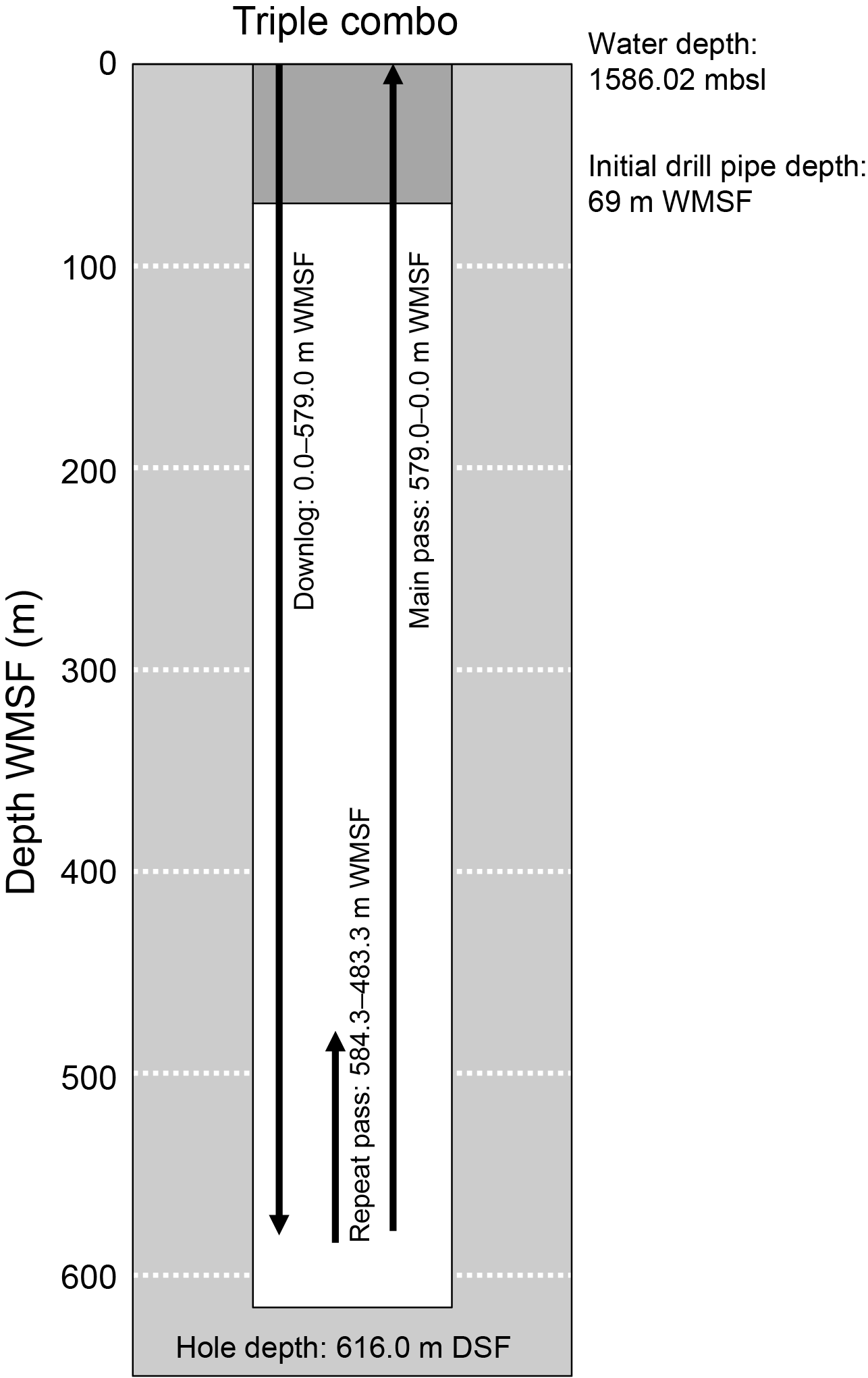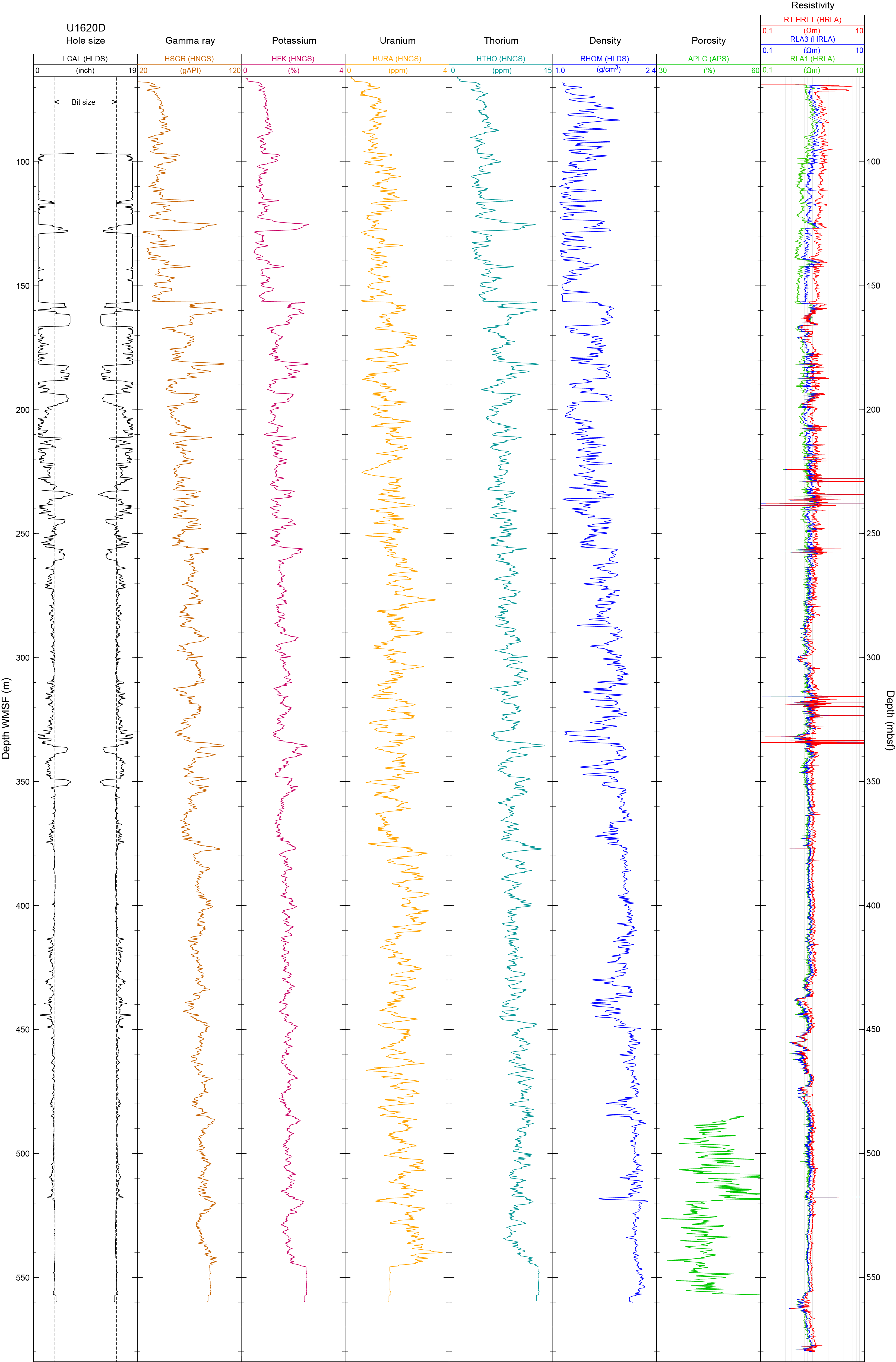 In Hole U1620D, downhole logging was conducted using the triple combo tool string to obtain multiple in situ property measurements (Figure F50). The logging run using the FMS-sonic was canceled after observing gradually swelling formations with a closing rate of about 1 inch/h that were likely to block the hole and/or trap the logging string during operations. After the BHA was set at 71.5 m wireline log matched depth below seafloor (WMSF), the string was first lowered to 580.0 m WMSF for the downlog with the caliper closed. A downlog of the Hostile Environment Litho-Density Sonde (HLDS) was not obtained. Subsequently, the tool string was pulled up for the first uplog from 584.3 to 483.3 m WMSF. To increase data recovery, the strings were lowered again to 579.0 m WMSF and pulled up to 0 m WMSF for the second uplog. The average peak-to-peak heave was estimated at 0.3 m. The heave compensator was utilized during the logging operation.