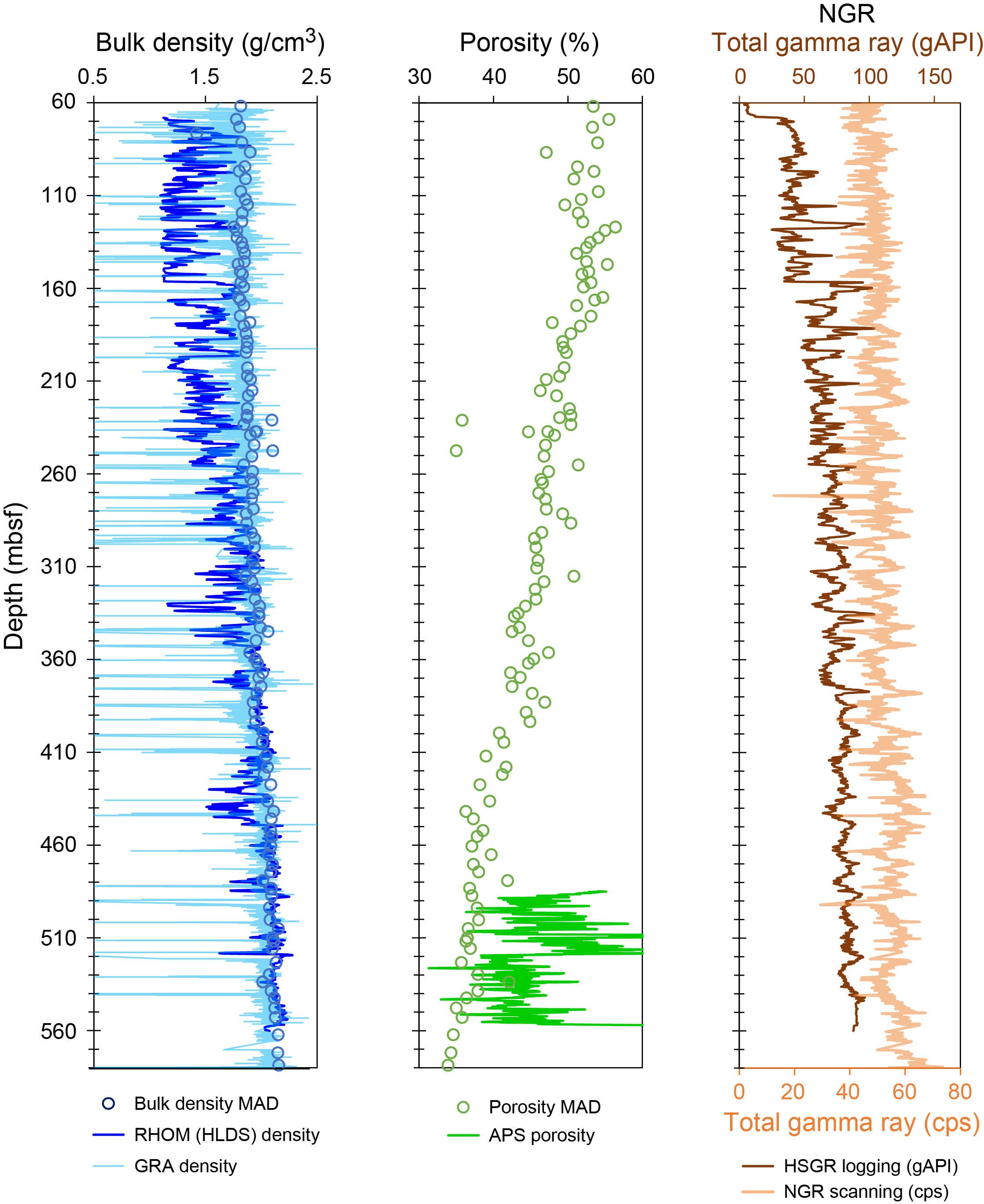 HLDS density log measurements from 68 to 560 m WMSF (below the drill pipe) are on average 1.74 g/cm3 and show a downhole trend but seem to suffer from bad contact of the probe with the borehole walls in the upper part (below ~260 m WMSF) and at several depths. Absolute values of the HLDS density measurements are very similar to densities derived from GRA bulk density core logging and discrete MAD measurements (Figure F52) within the intervals with good borehole condition. APS porosity showed unclear and unstable trends within the available data (~484.9 to ~584.3 m WMSF).