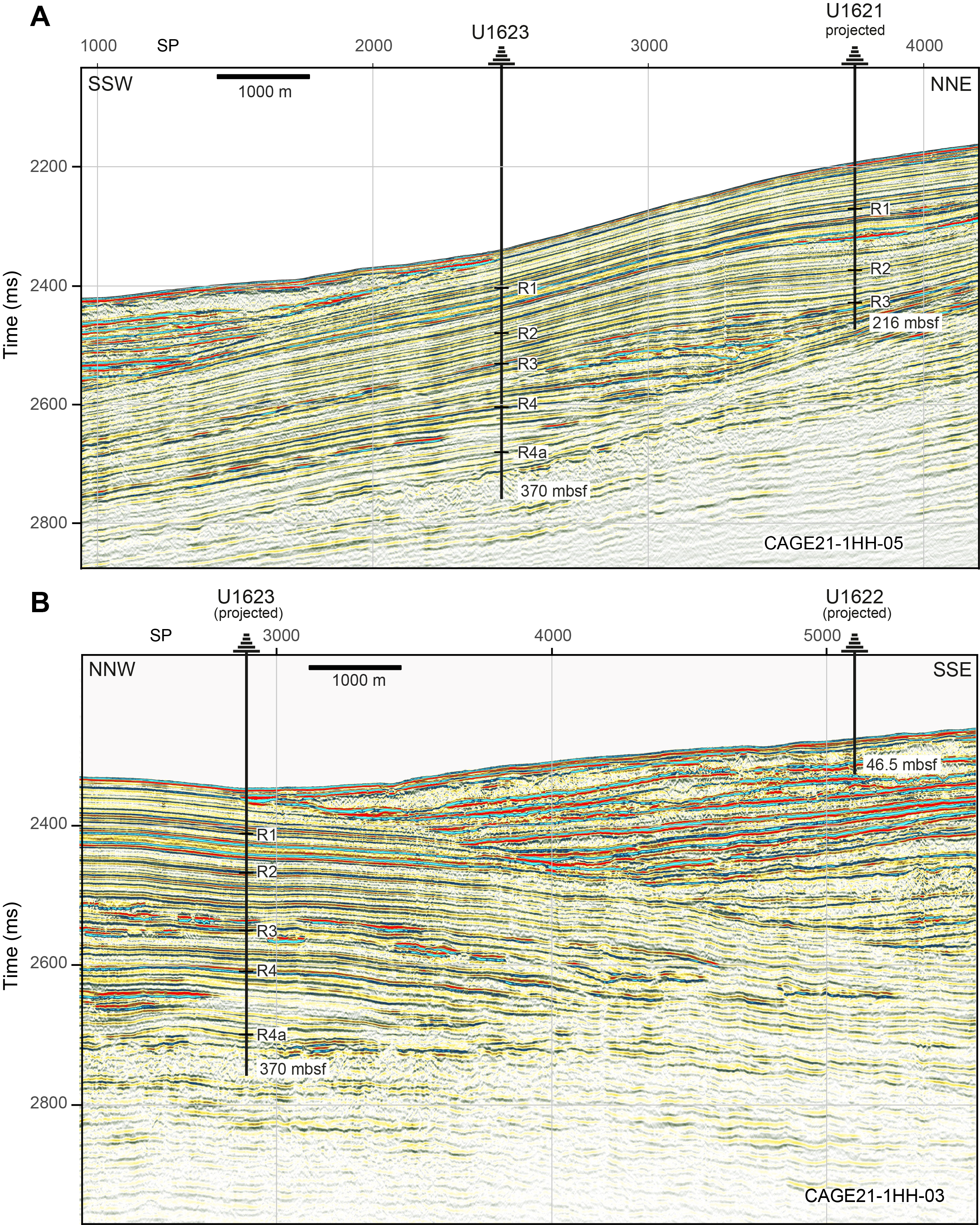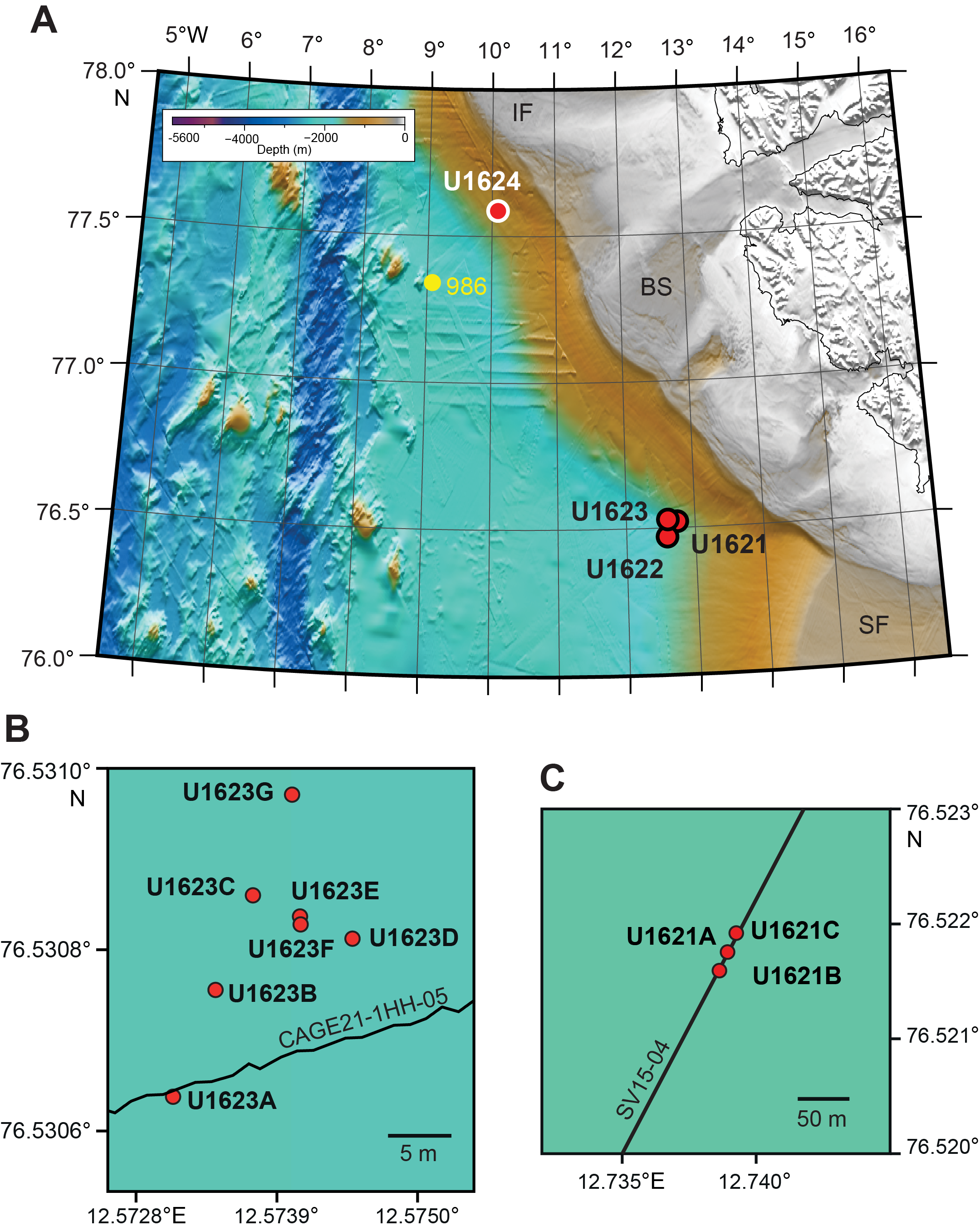 The drill sites on the Bellsund drift (Sites U1621 and U1623) are designed to recover an expanded sedimentary sequence to specifically examine suborbital oscillations of the last 100 ky, the mid-Brunhes event (~400 ka), the mid-Pleistocene transition (~1.2–0.7 Ma), and the primary establishment of shelf edge-glaciation in this area at about 1.3 Ma corresponding to Seismic Reflector R4A (Rebesco et al., 2014a). Site U1621 (Figure F2A) was chosen because seismic profiles indicate a highly expanded sediment record down to Seismic Reflector R3 (~0.75 Ma), with sedimentation rates potentially exceeding 300 m/My. Three holes were drilled at Site U1621 (Figure F1C) down to Seismic Reflector R3 (~225 meters below seafloor [mbsf]) with a maximum penetration depth of 216 mbsf. Because of a discrepancy in coordinate transcription, Site U1622 was drilled into the Storfjorden TMF (~8 km from the intended site) to 46.5 mbsf (Figure F2B). Site U1623 was located ~4.4 km downslope from Site U1621 (Figure F2A) to drill a longer record down to Seismic Reflector R4A (~1.3 Ma; ~347 mbsf). Seven holes were drilled at Site U1623 (Figure F1B) with a maximum drilled depth of 370 mbsf. Water depths at all three sites were between 1636 and 1715 m.