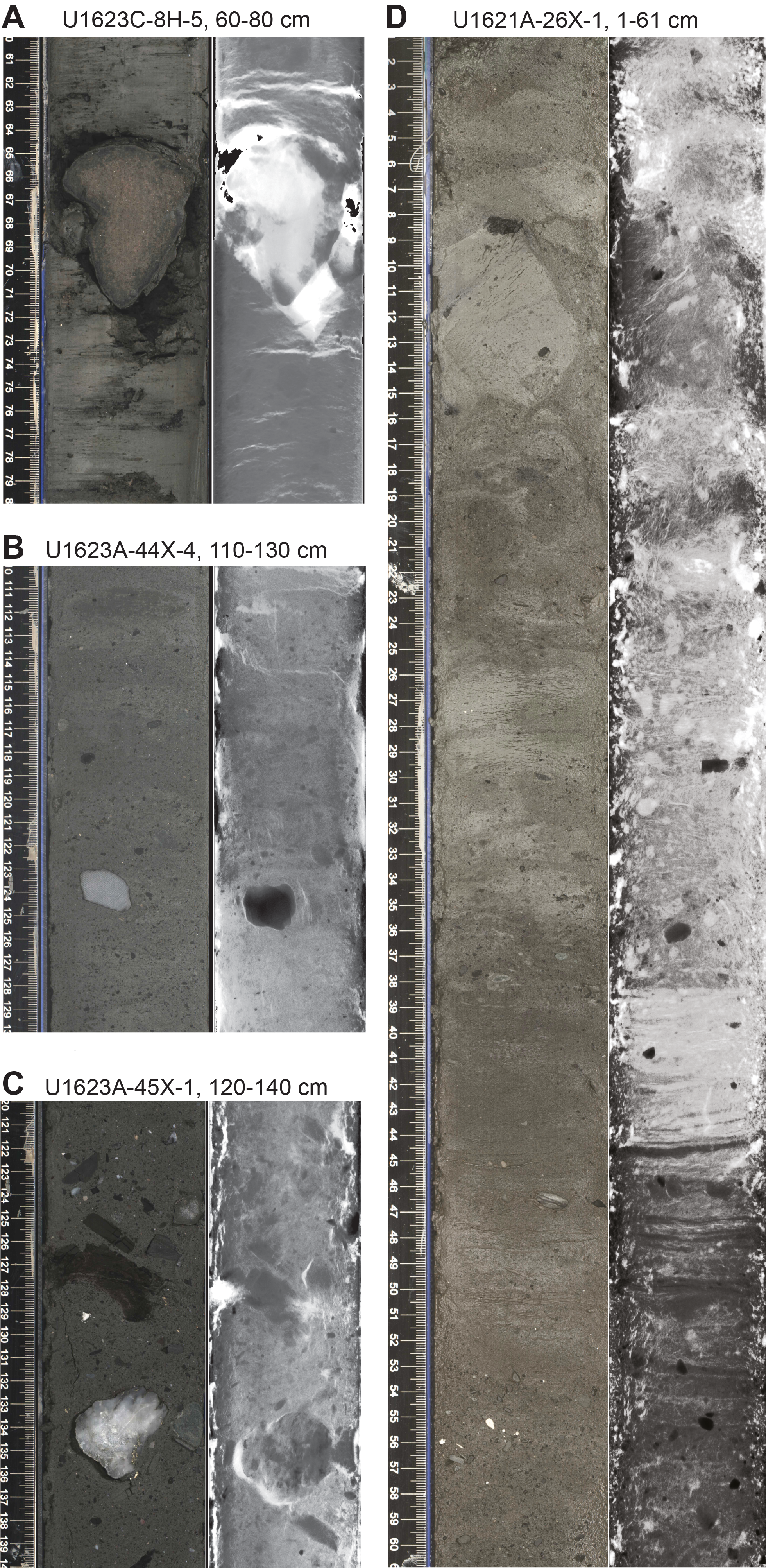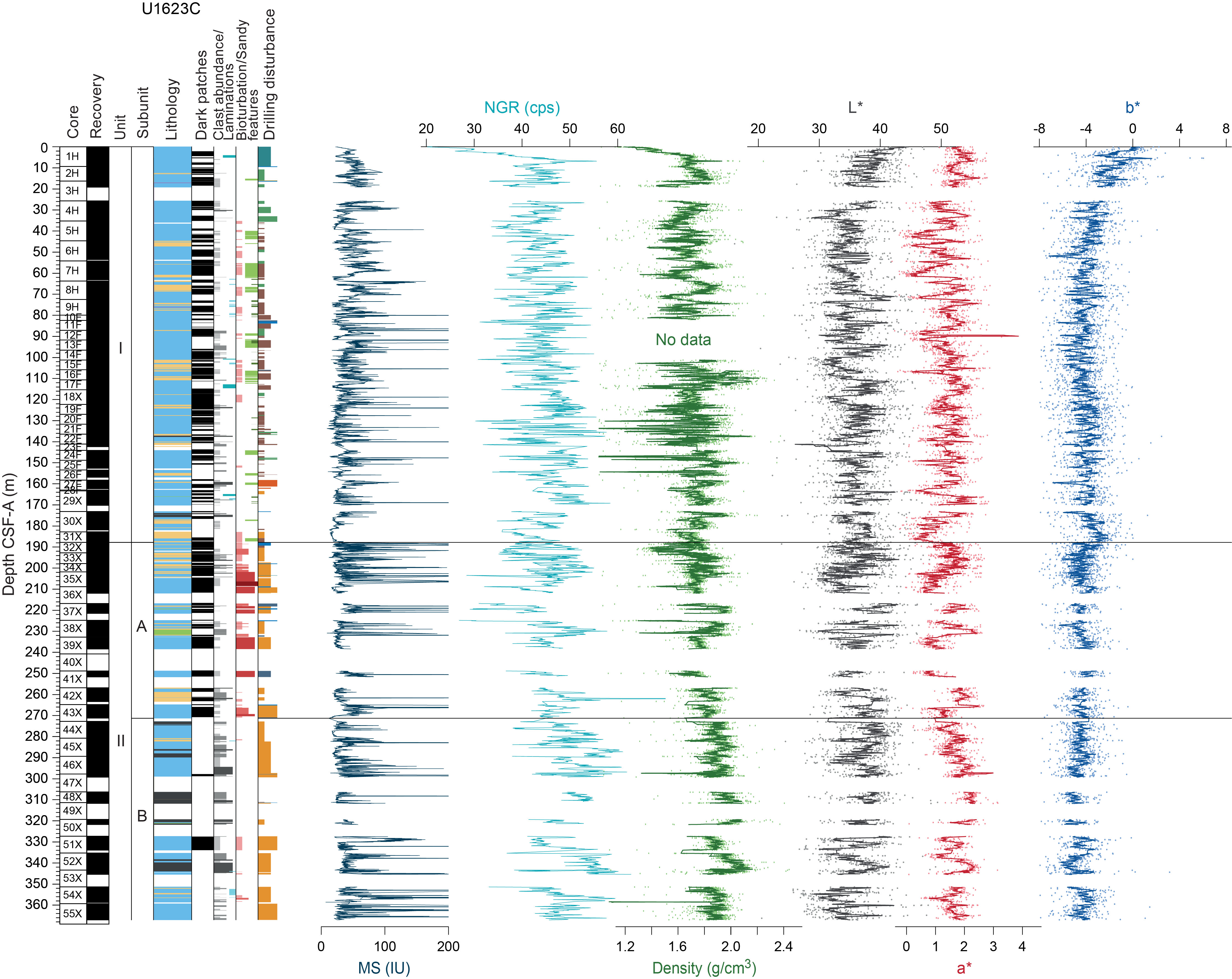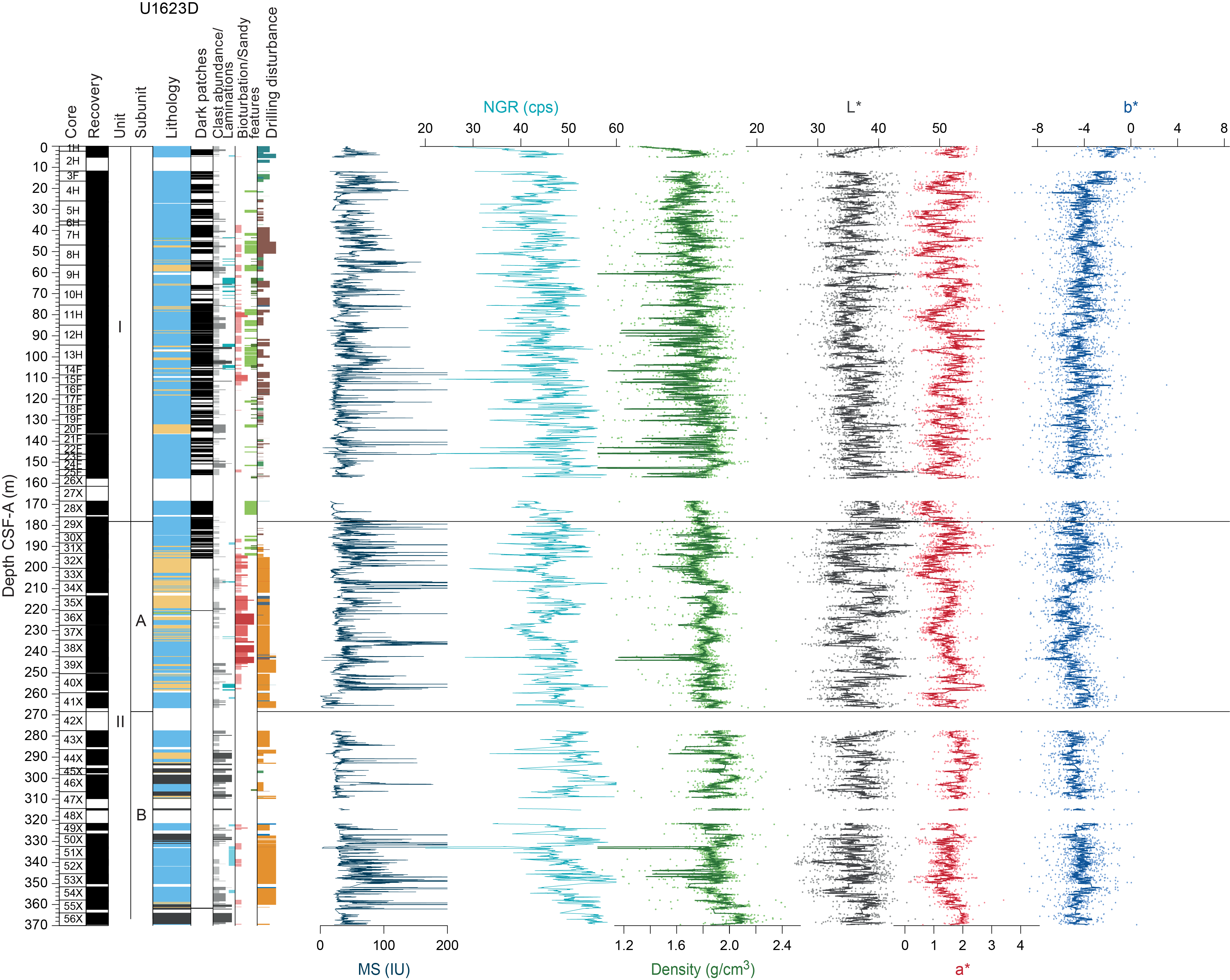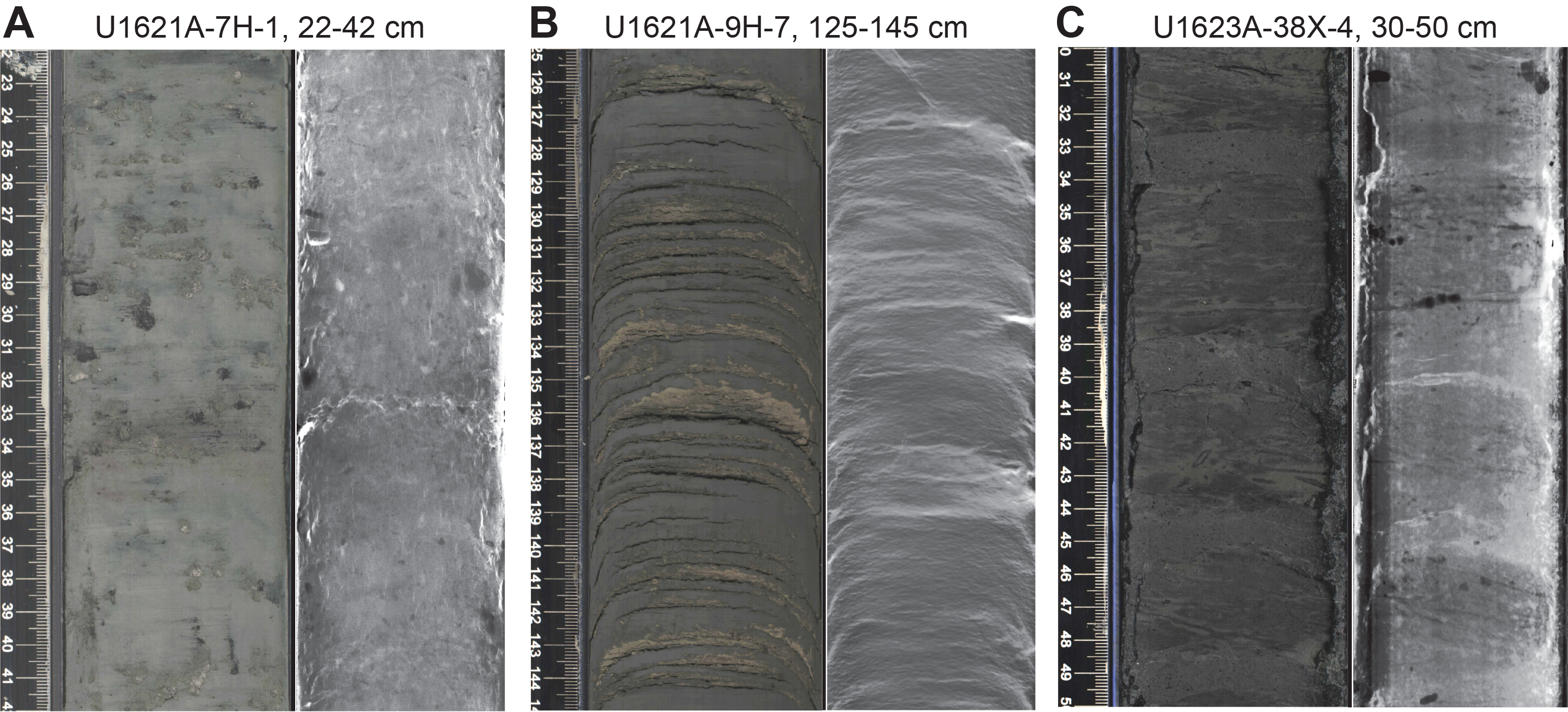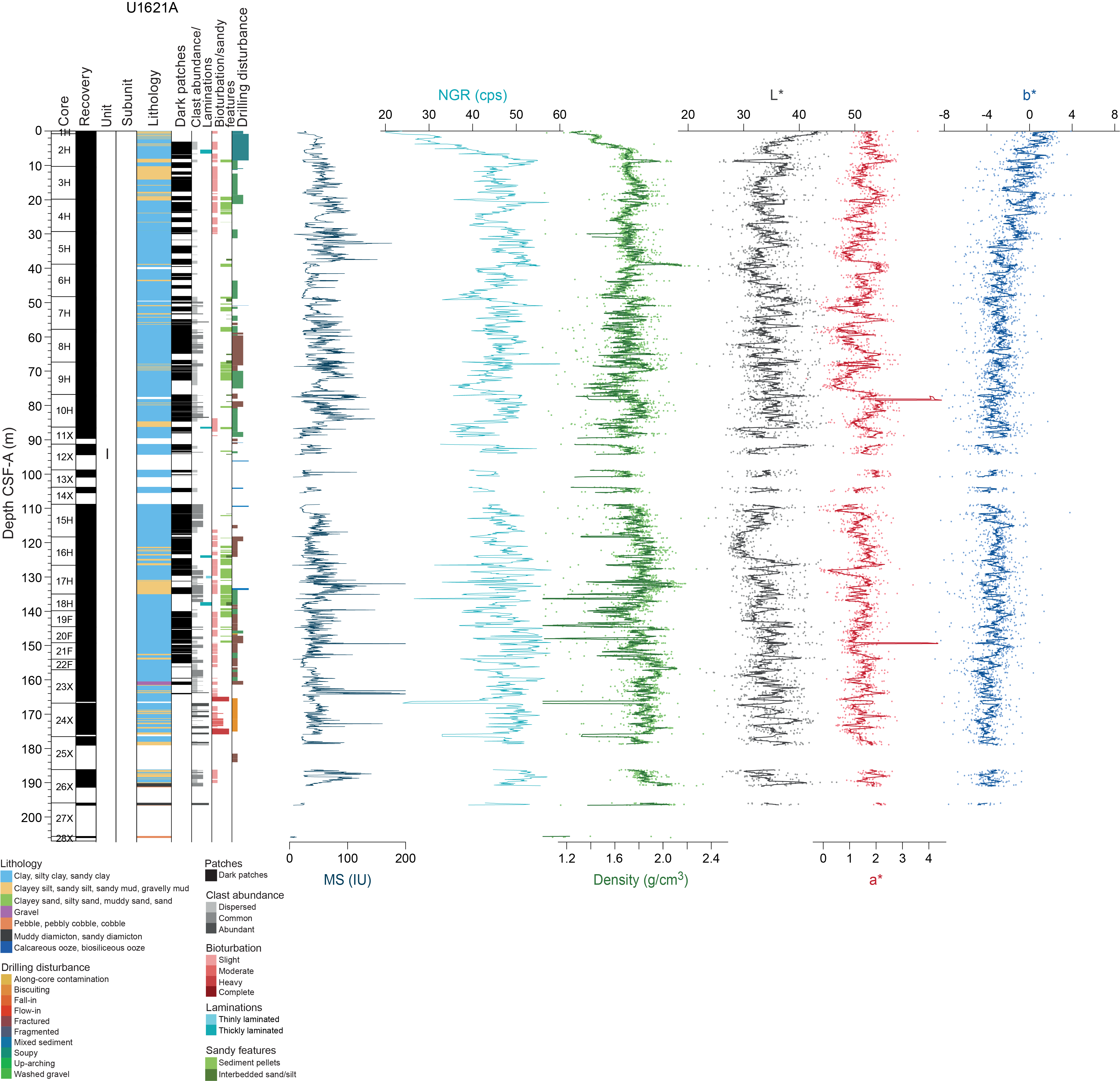 Sedimentary structures are not always visible on the split core surface (i.e., described as structureless), but primary (e.g., lamination) and secondary (e.g., iron sulfide minerals) structures are often observed in the X-radiographs. The sedimentologic characteristics of Site U1621 (Holes U1621A–U1621C) are summarized in Figures F6, F7, and F8; Site U1622 (Hole U1622A) in Figure F9; and Site U1623 (Holes U1623A, U1623C, U1623D, U1623F, and U1623G) in Figures F10, F11, F12, F13, and F14. These figures include information on core recovery; lithology as inferred from observations of the split core surfaces, X-radiographs, and smear slides; clast abundance; occurrence of sand patches and interbedded silty clay/silt layers; laminations; bioturbation; and drilling disturbance. Summary lithologic information for each hole is plotted along with select physical properties data, including magnetic susceptibility (MS), natural gamma radiation (NGR), gamma ray attenuation (GRA) density, and sediment color reflectance (CIELAB L*, a*, and b*).