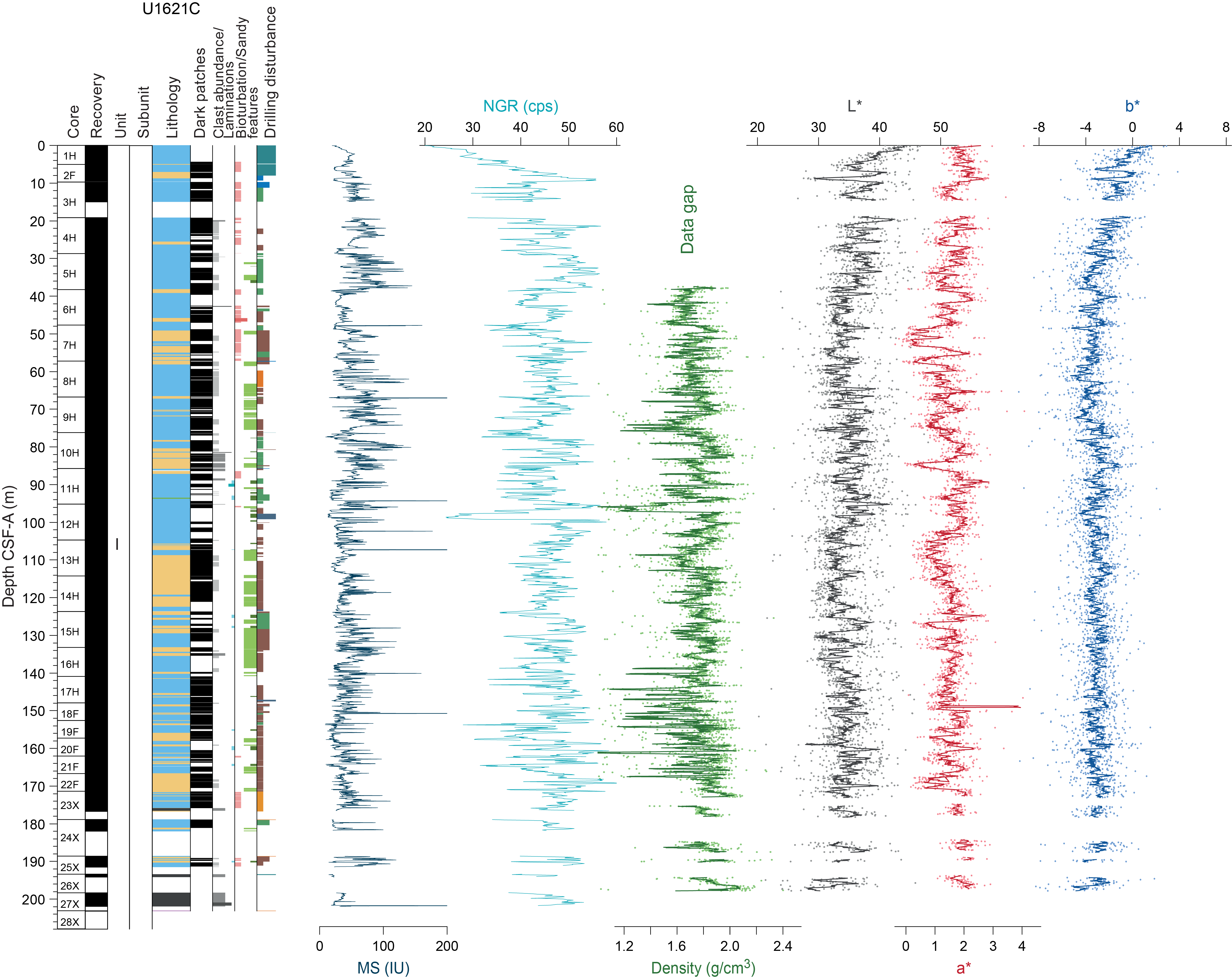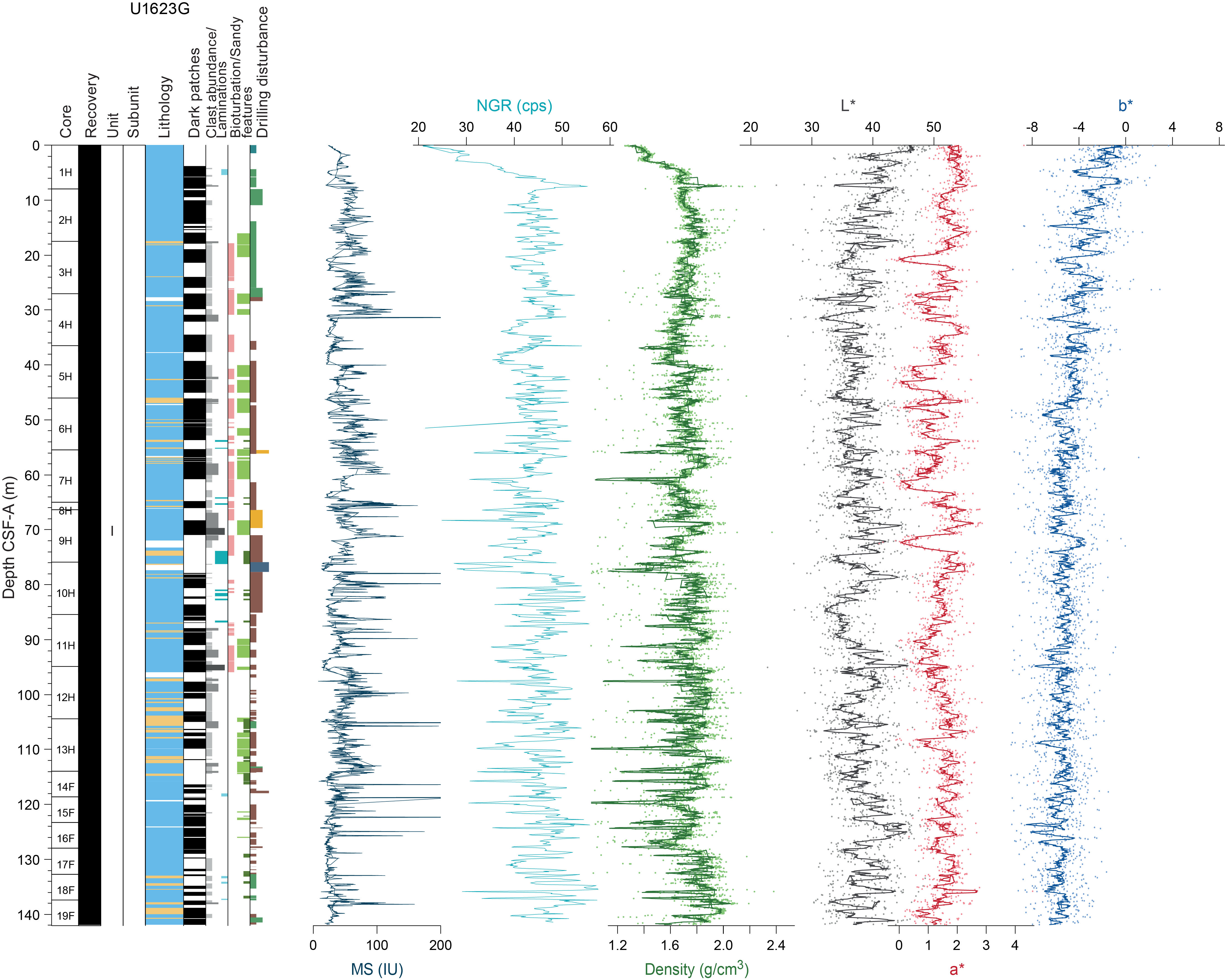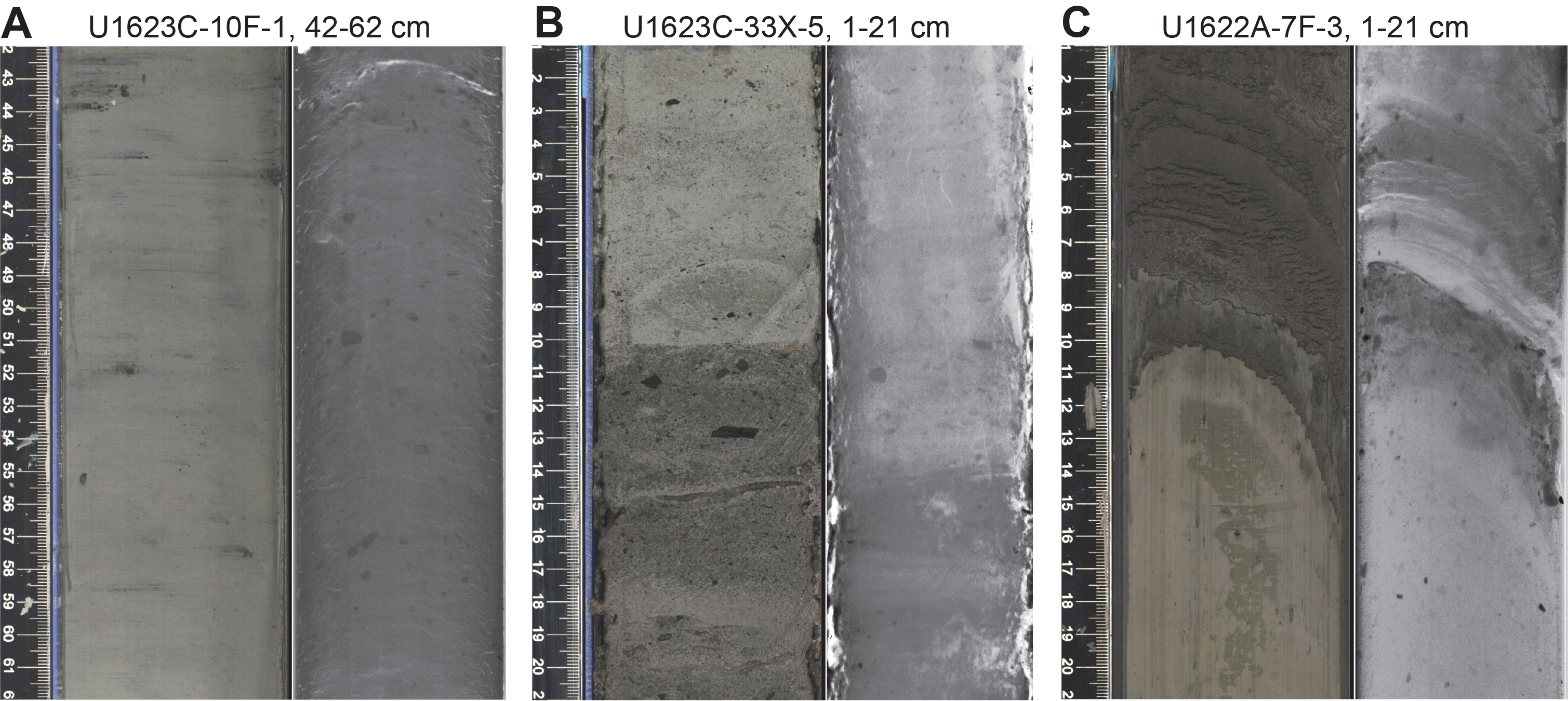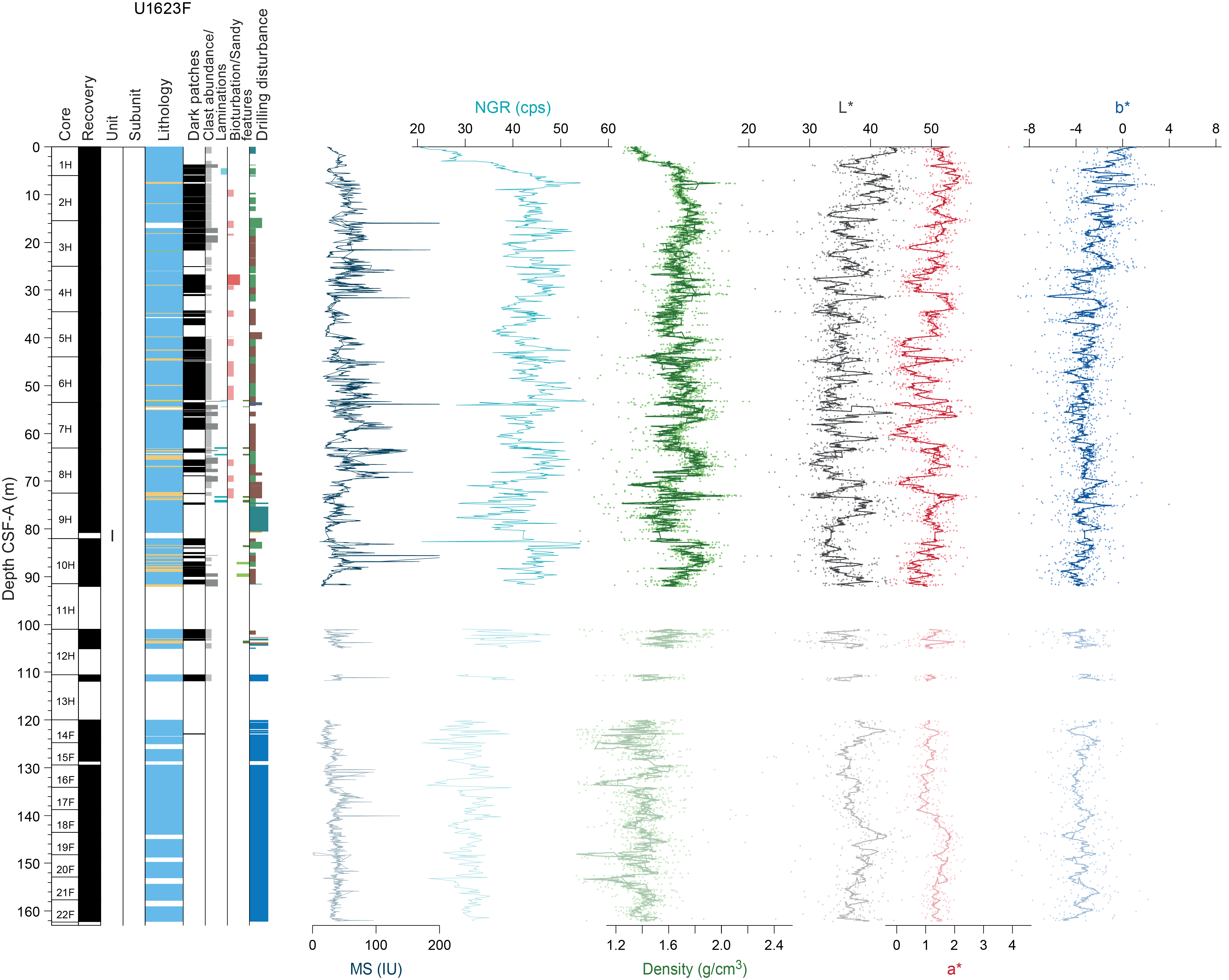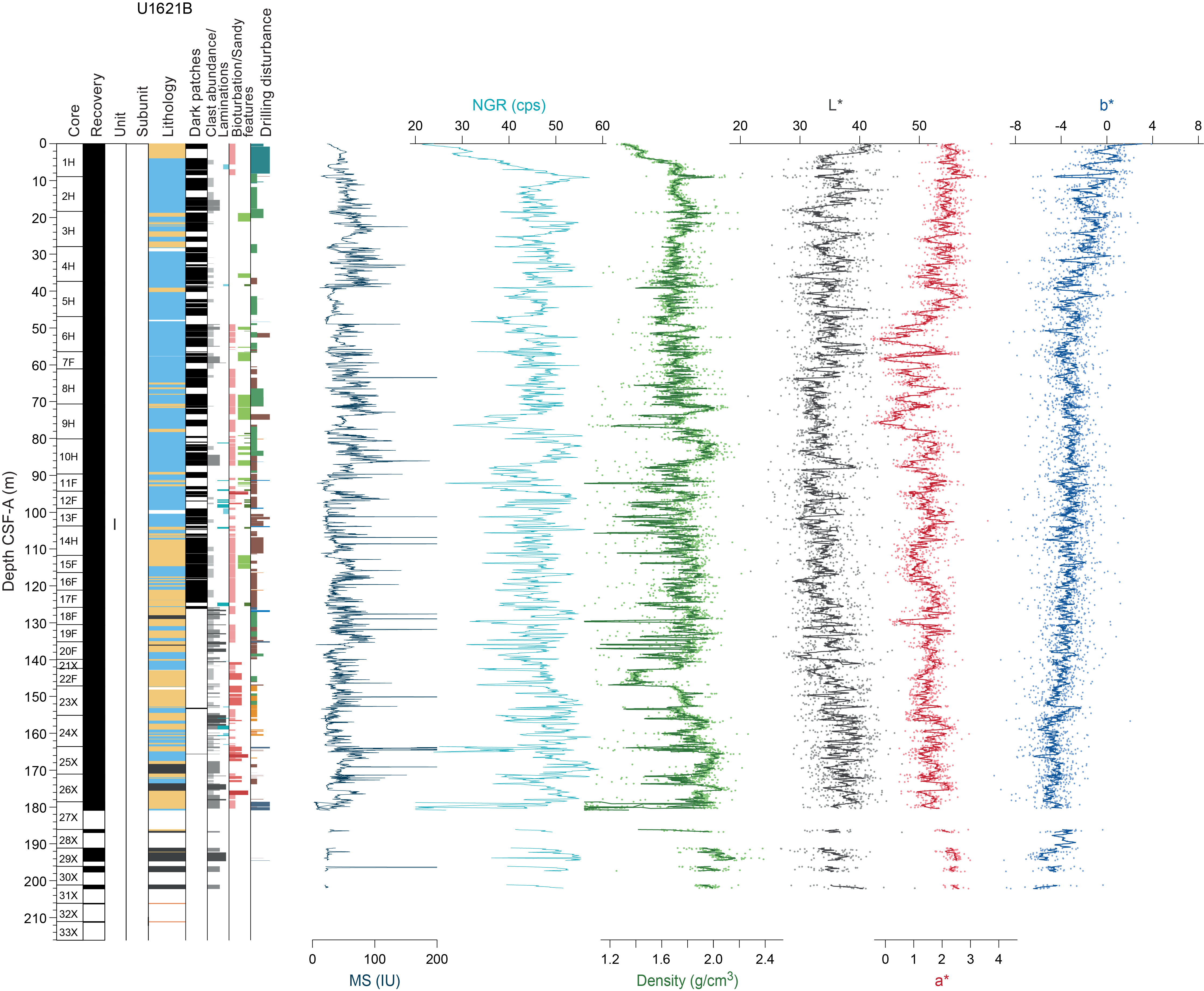 Sedimentary structures are not always visible on the split core surface (i.e., described as structureless), but primary (e.g., lamination) and secondary (e.g., iron sulfide minerals) structures are often observed in the X-radiographs. The sedimentologic characteristics of Site U1621 (Holes U1621A–U1621C) are summarized in Figures F6, F7, and F8; Site U1622 (Hole U1622A) in Figure F9; and Site U1623 (Holes U1623A, U1623C, U1623D, U1623F, and U1623G) in Figures F10, F11, F12, F13, and F14. These figures include information on core recovery; lithology as inferred from observations of the split core surfaces, X-radiographs, and smear slides; clast abundance; occurrence of sand patches and interbedded silty clay/silt layers; laminations; bioturbation; and drilling disturbance. Summary lithologic information for each hole is plotted along with select physical properties data, including magnetic susceptibility (MS), natural gamma radiation (NGR), gamma ray attenuation (GRA) density, and sediment color reflectance (CIELAB L*, a*, and b*).