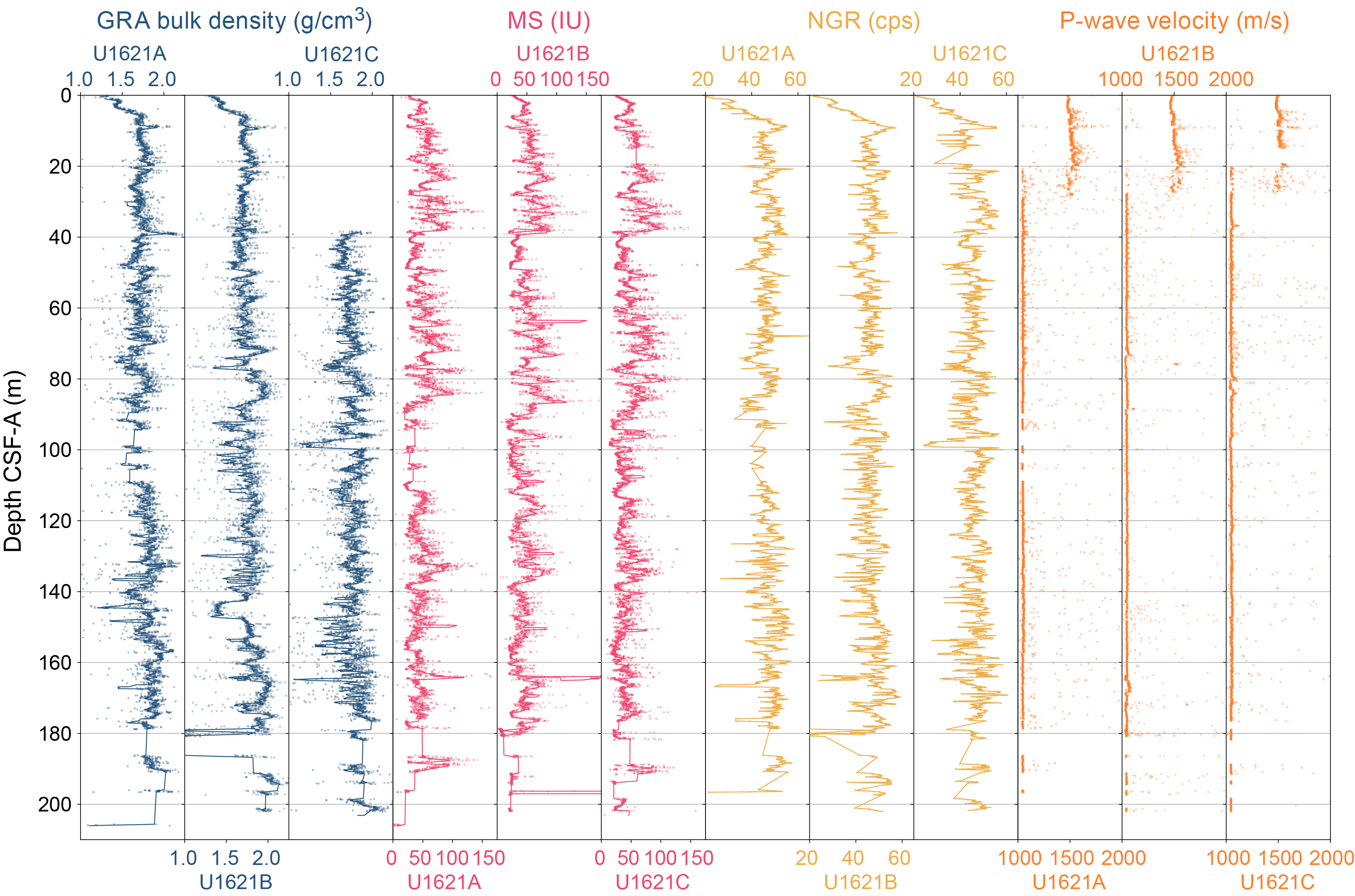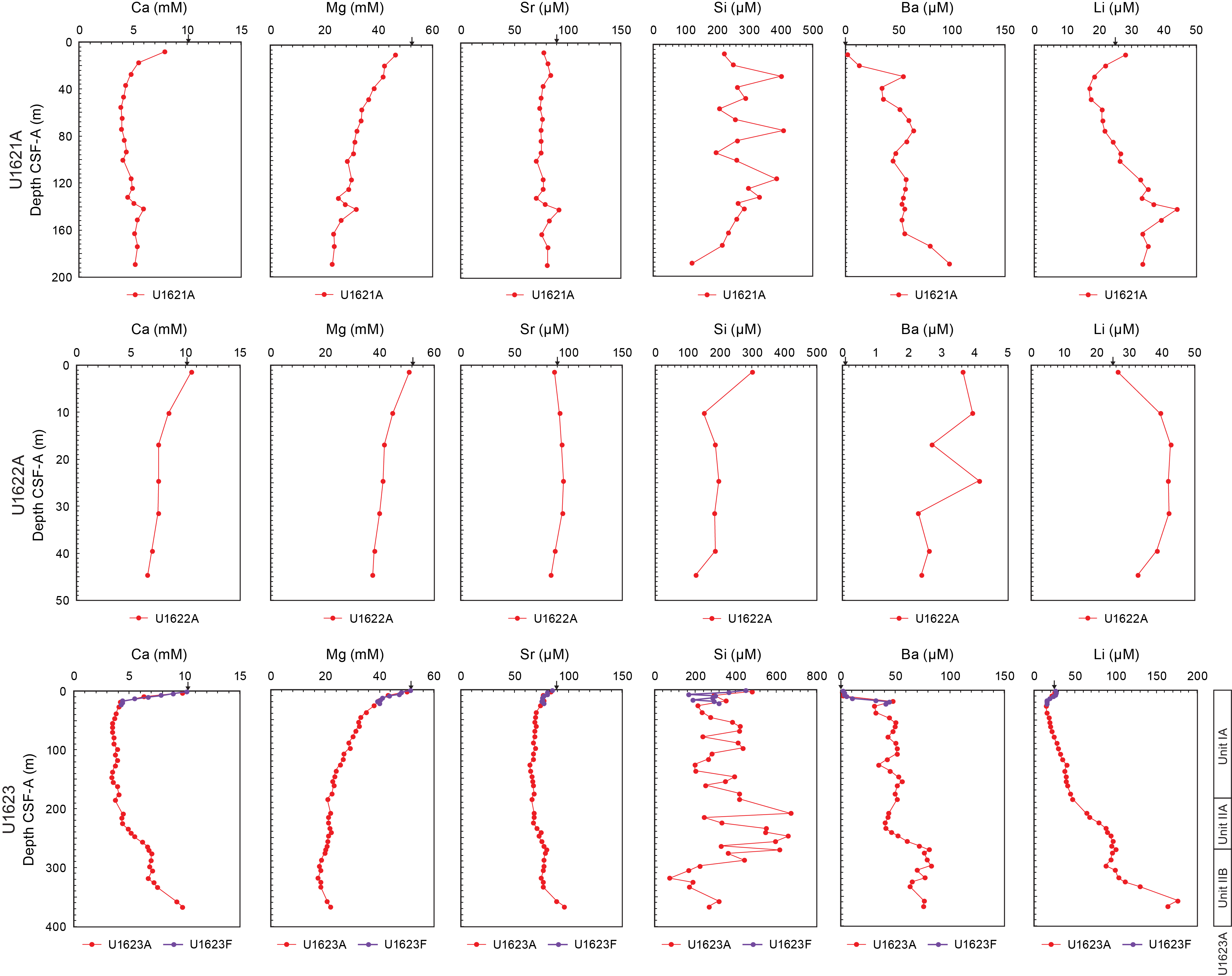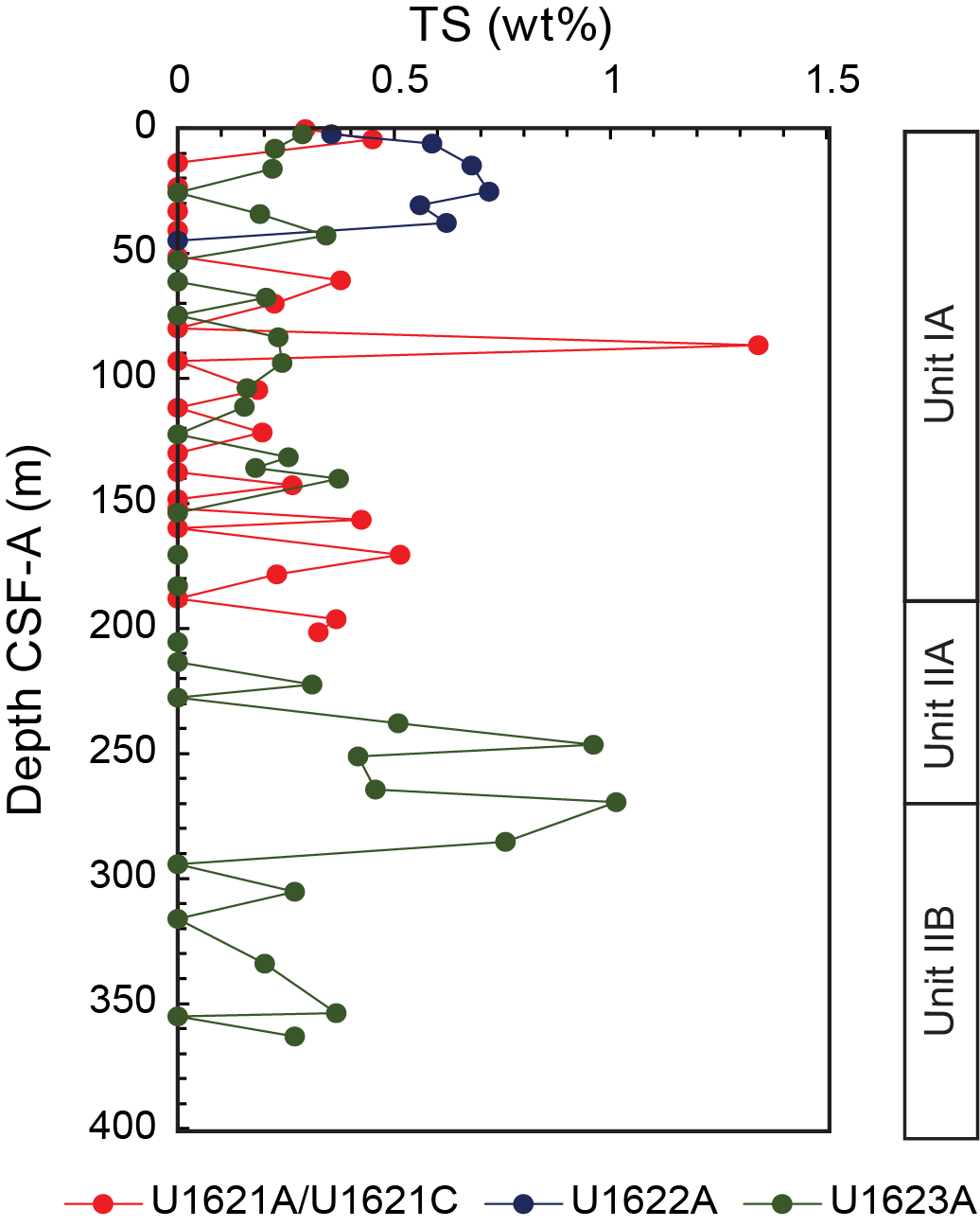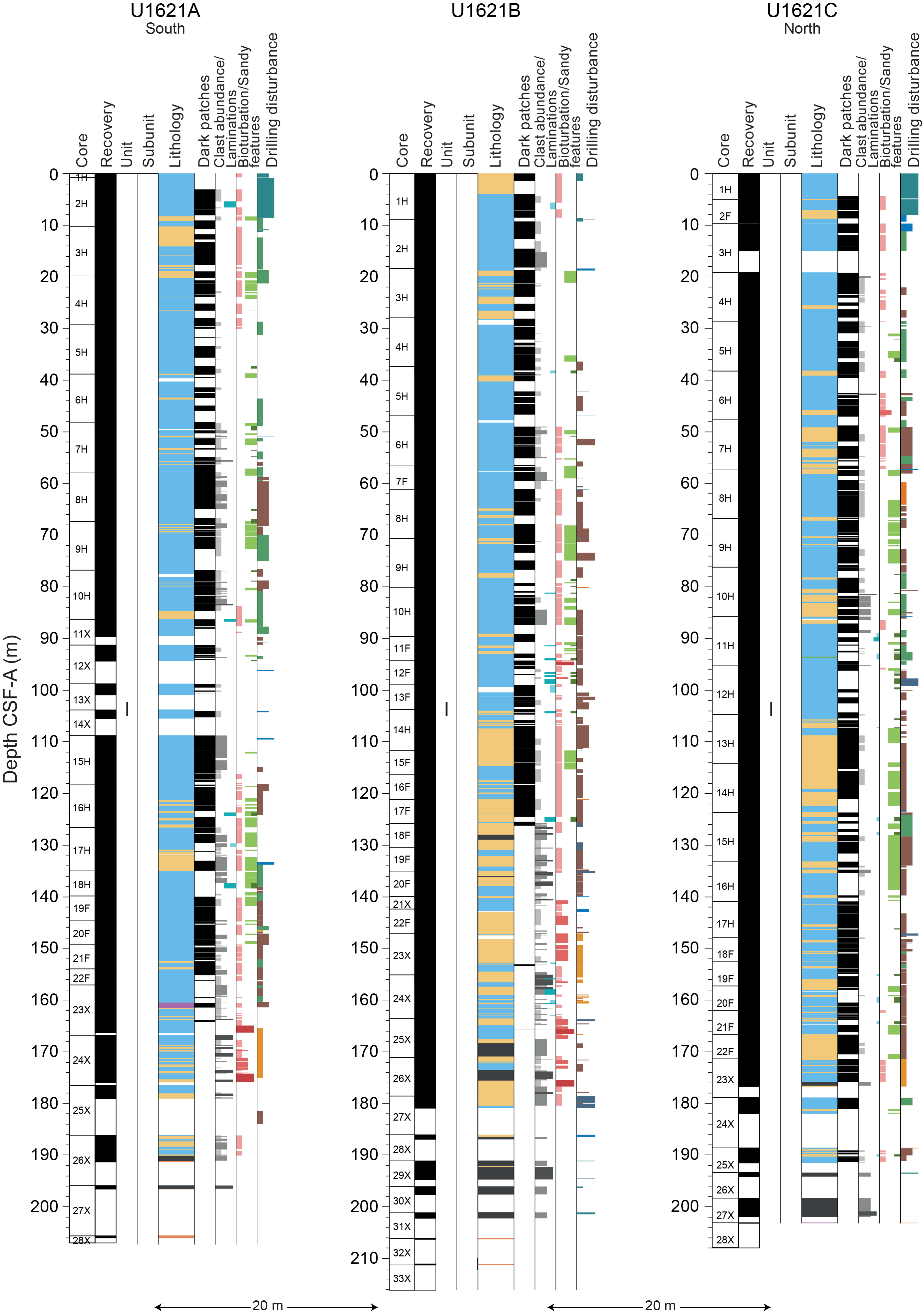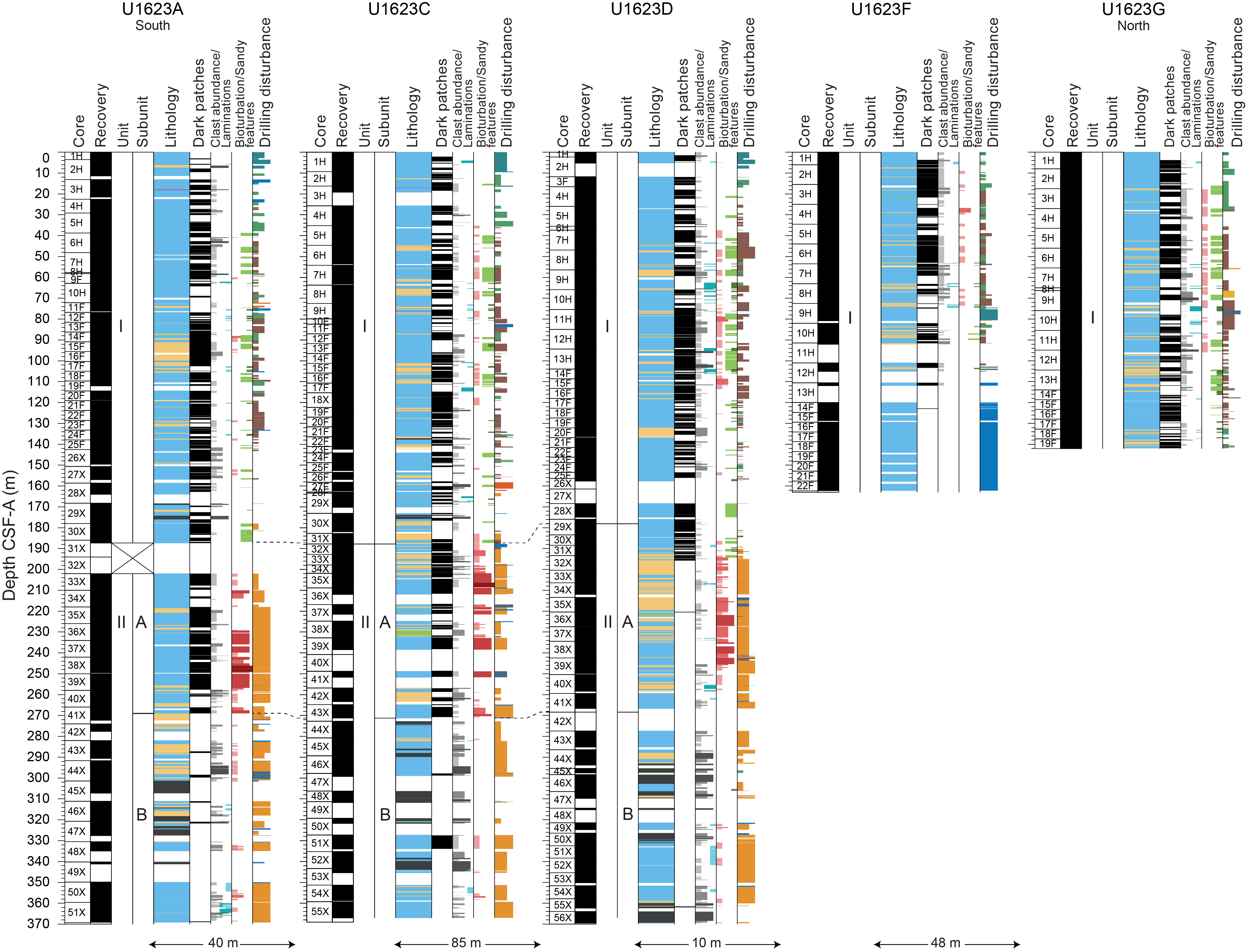 - Depths: Hole U1621A = 0–206.06 mbsf; Hole U1621B = 0–211.24 mbsf; Hole U1621C = 0–203.19 mbsf; Hole U1622A = 0–46.91 mbsf; Hole U1623A = 0–187.35 mbsf; Hole U1623C = 0–191.63 mbsf; Hole U1623D = 0–178.13 mbsf; Hole U1623F = 0–162.20 mbsf; Hole U1623G = 0–141.86 mbsf