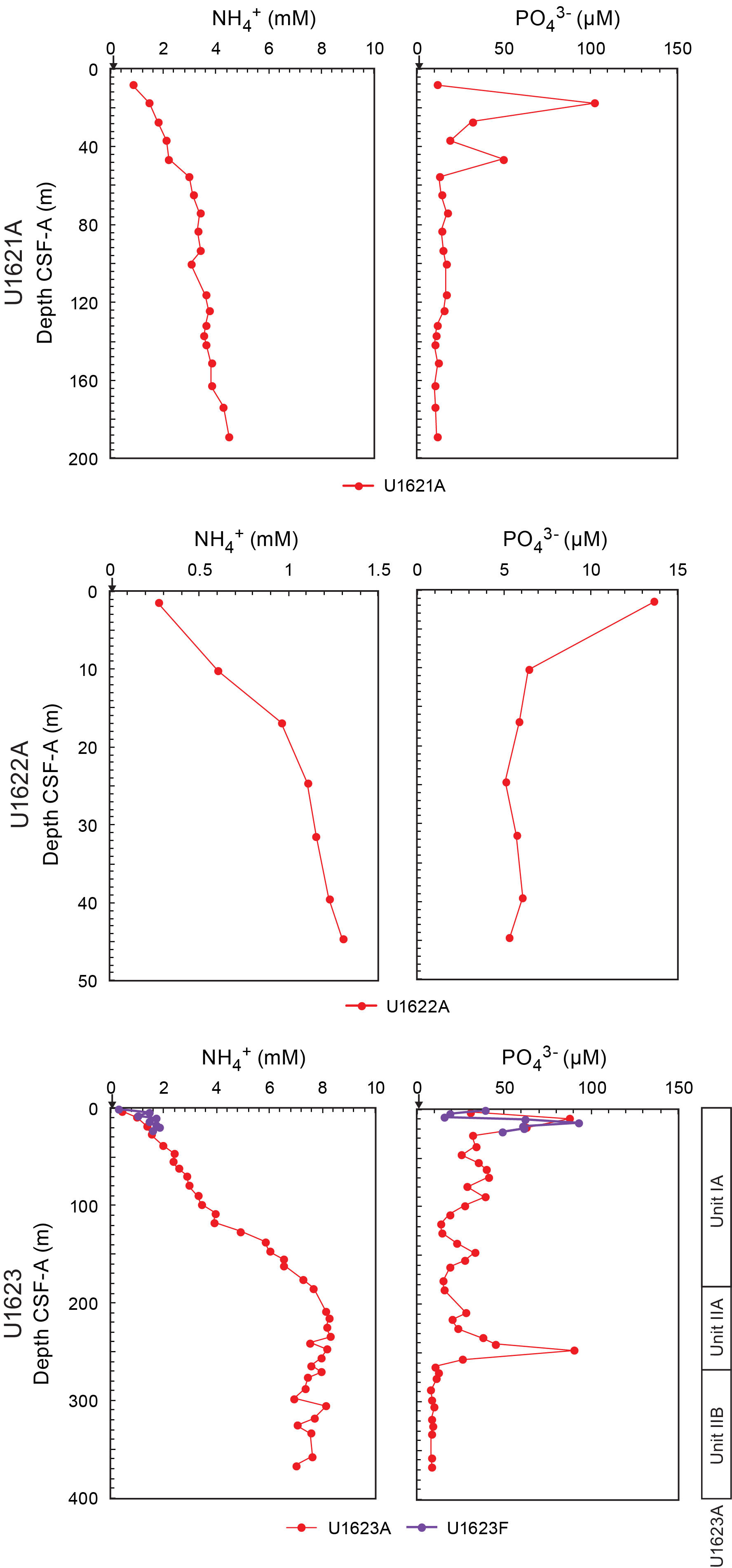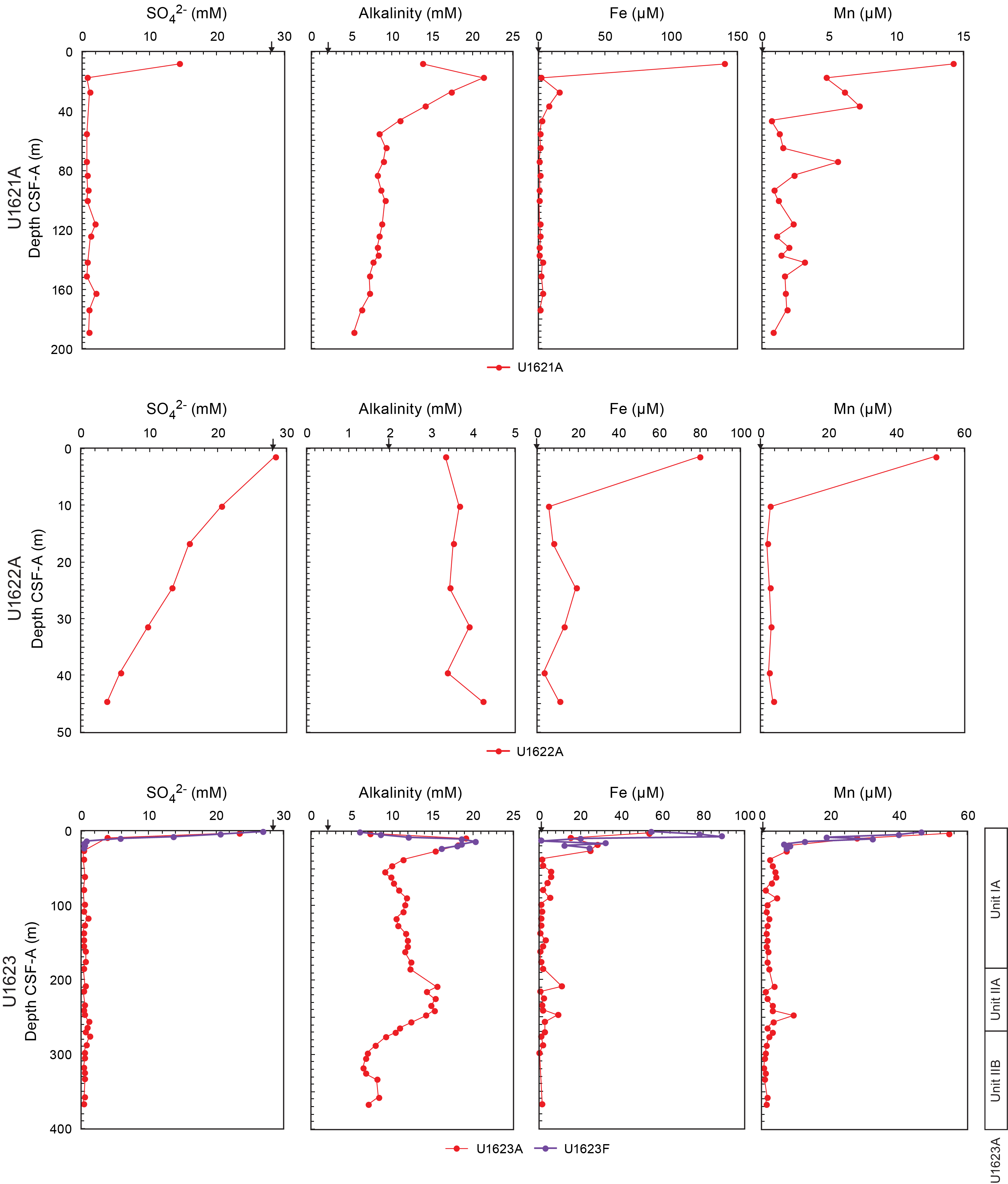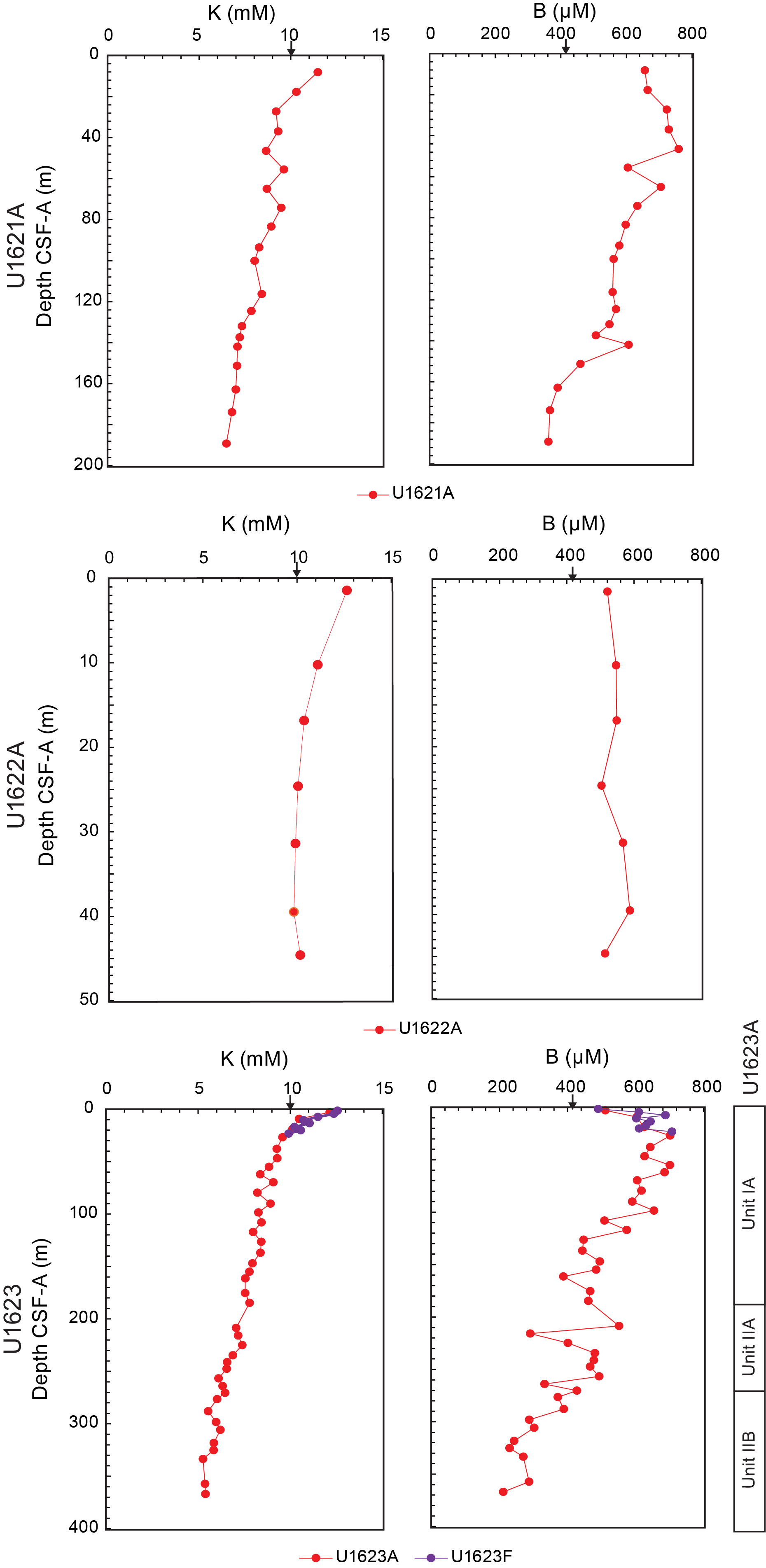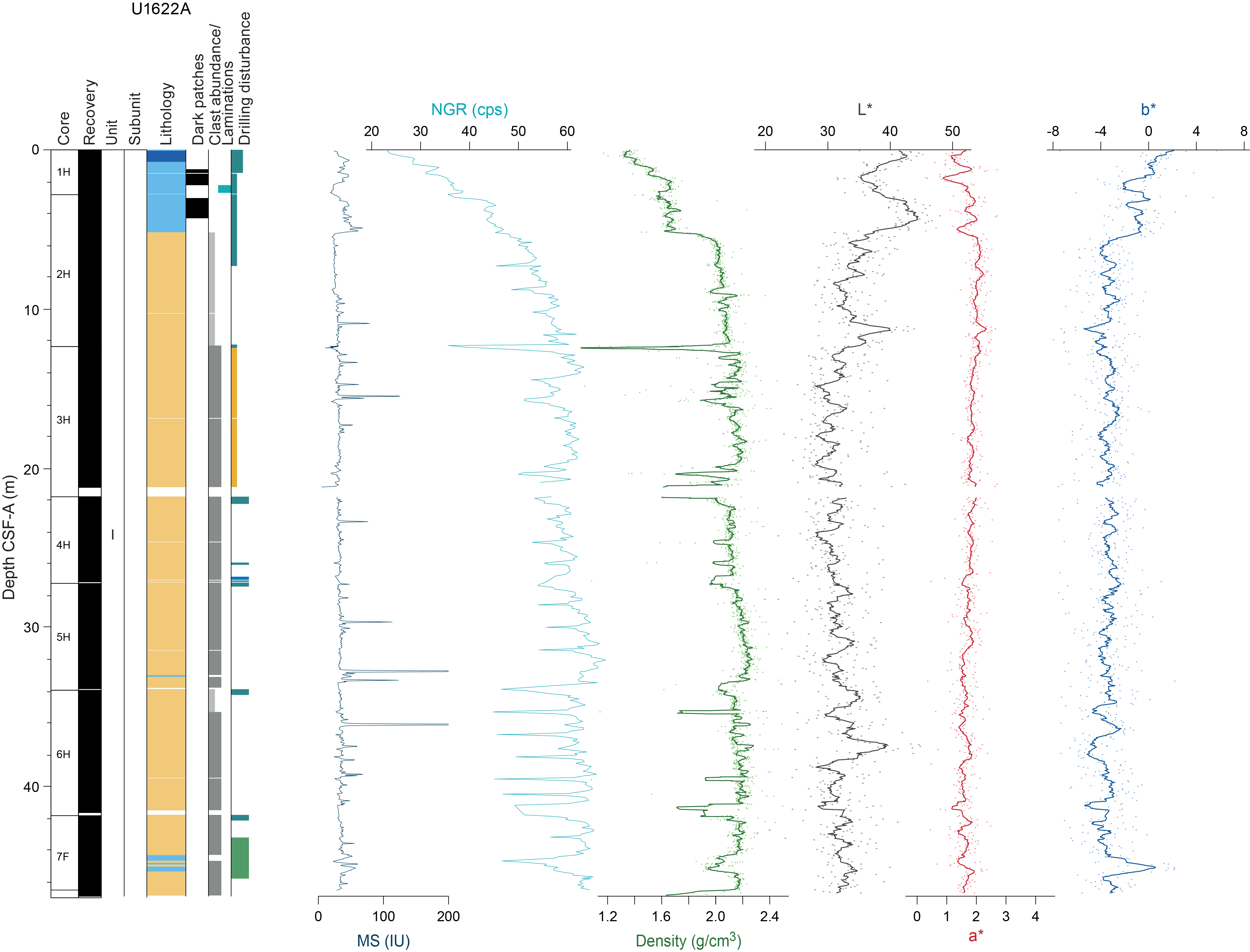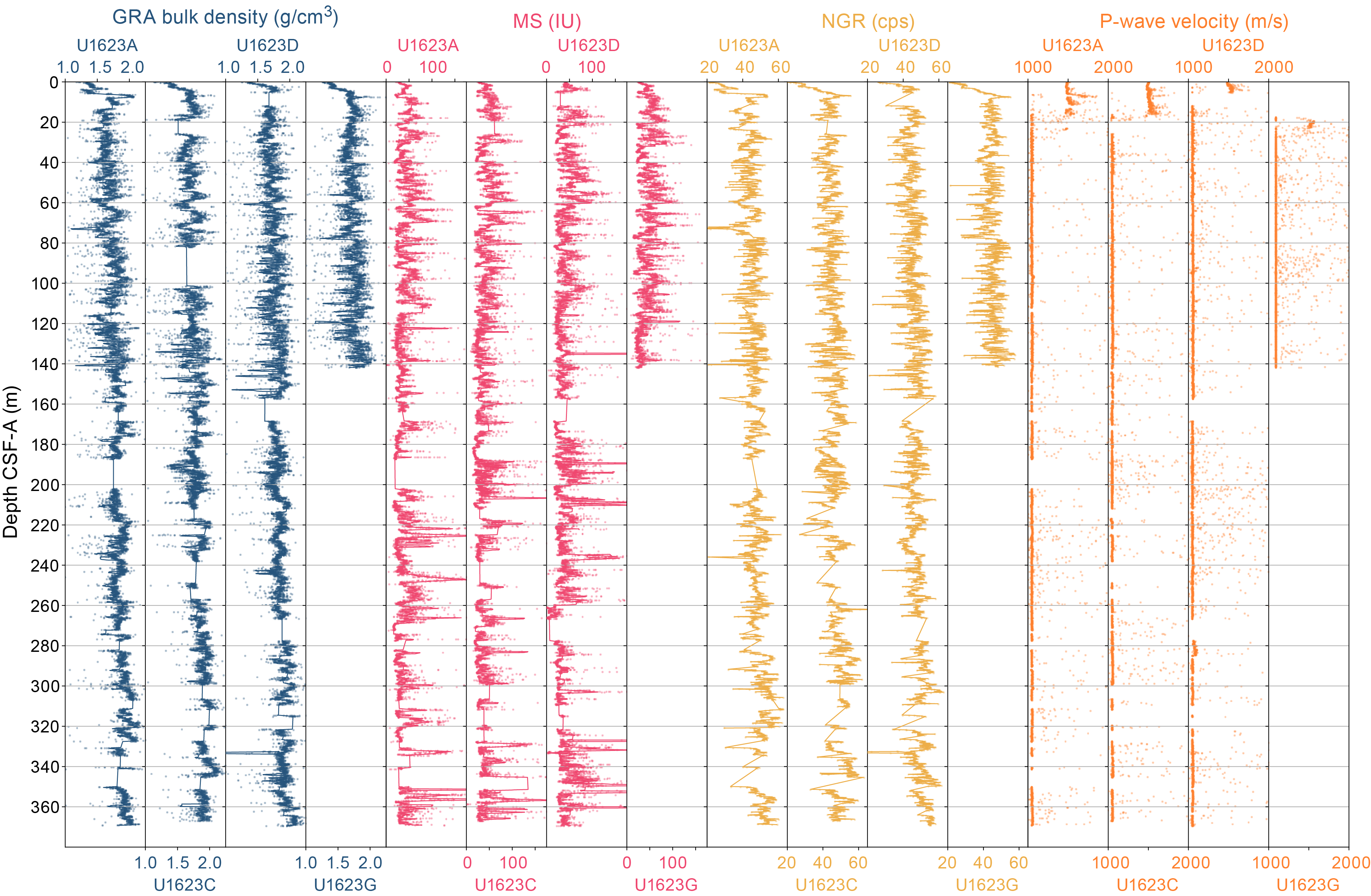 - Depths: Hole U1621A = 0–206.06 mbsf; Hole U1621B = 0–211.24 mbsf; Hole U1621C = 0–203.19 mbsf; Hole U1622A = 0–46.91 mbsf; Hole U1623A = 0–187.35 mbsf; Hole U1623C = 0–191.63 mbsf; Hole U1623D = 0–178.13 mbsf; Hole U1623F = 0–162.20 mbsf; Hole U1623G = 0–141.86 mbsf