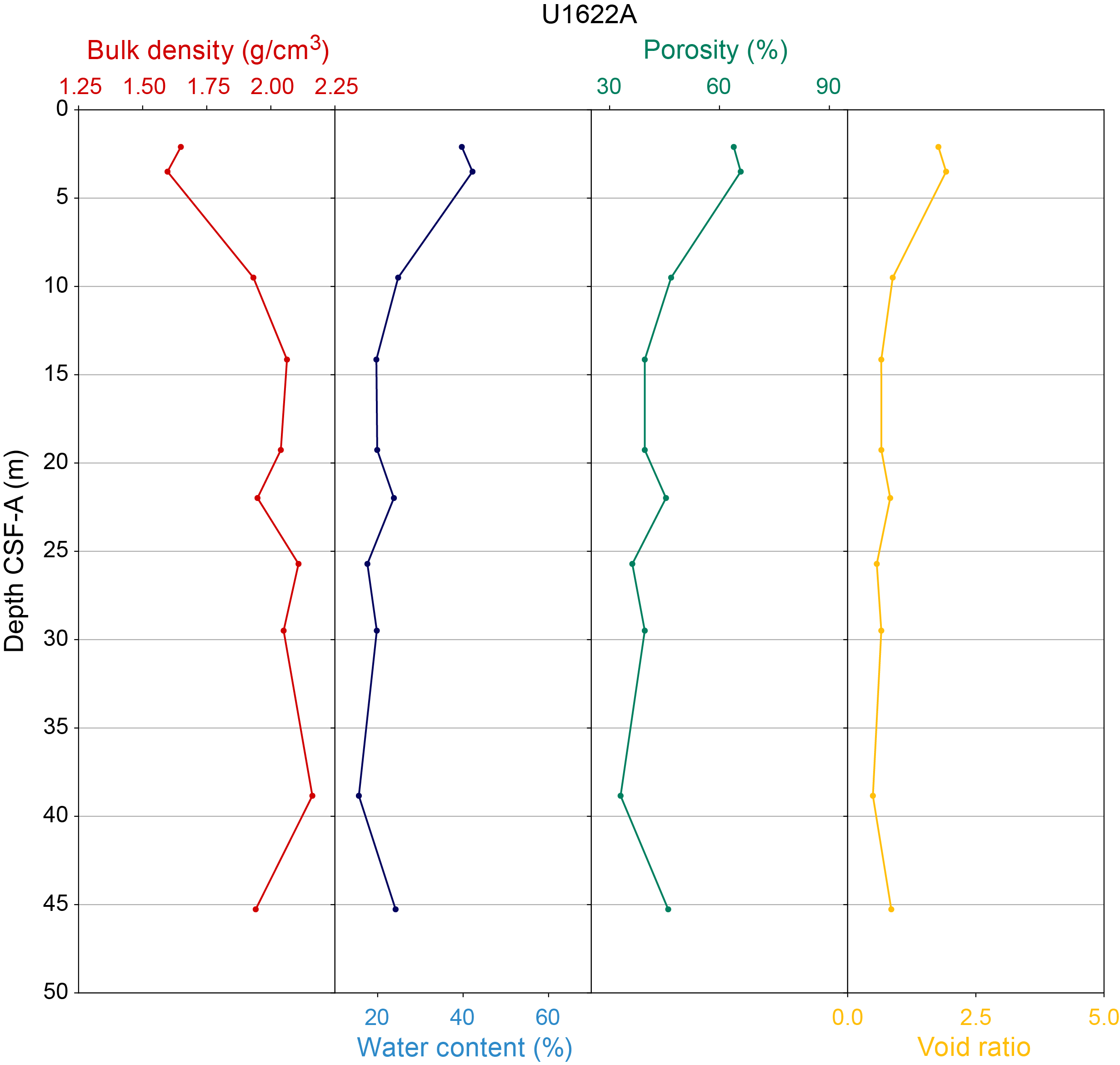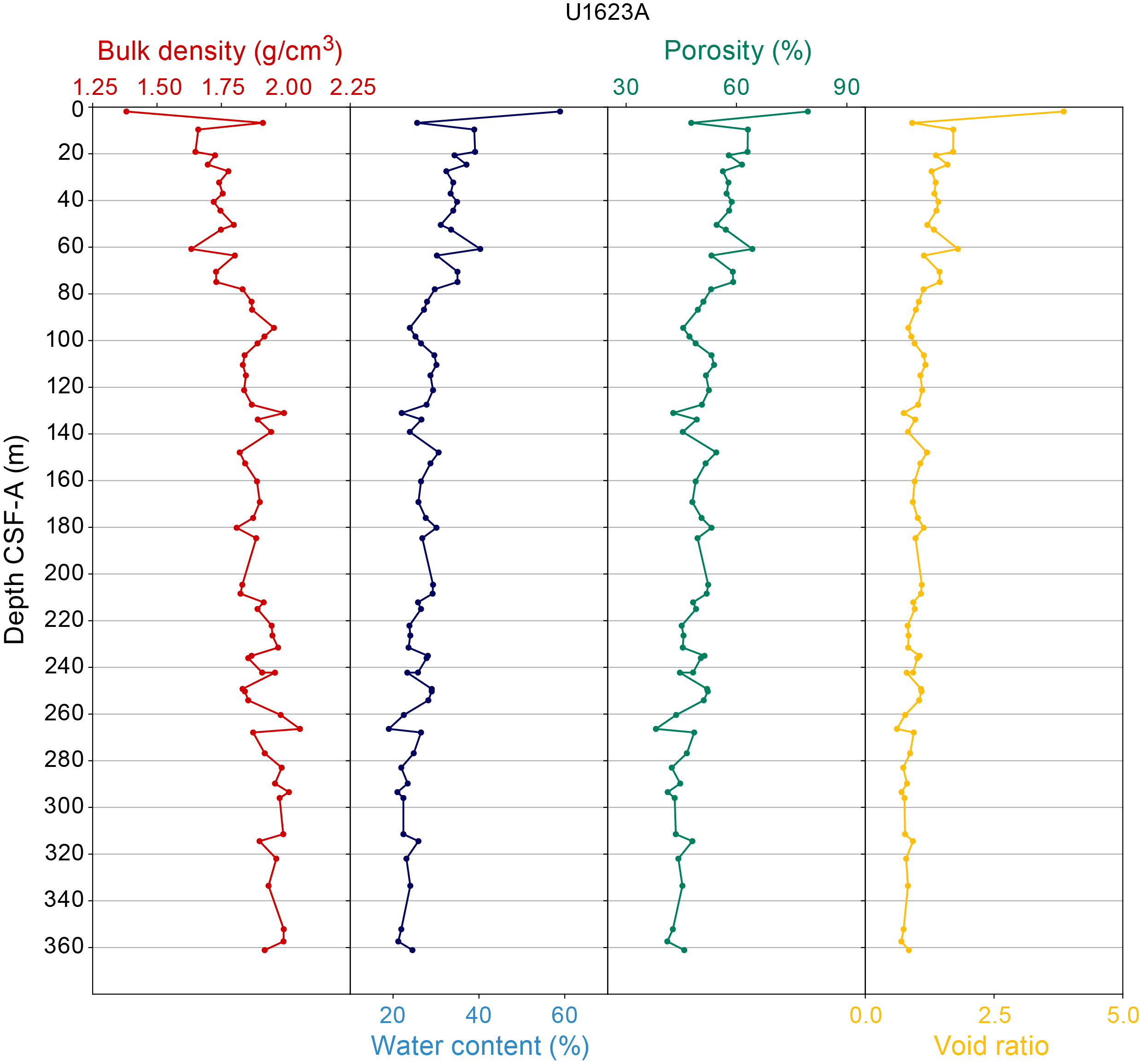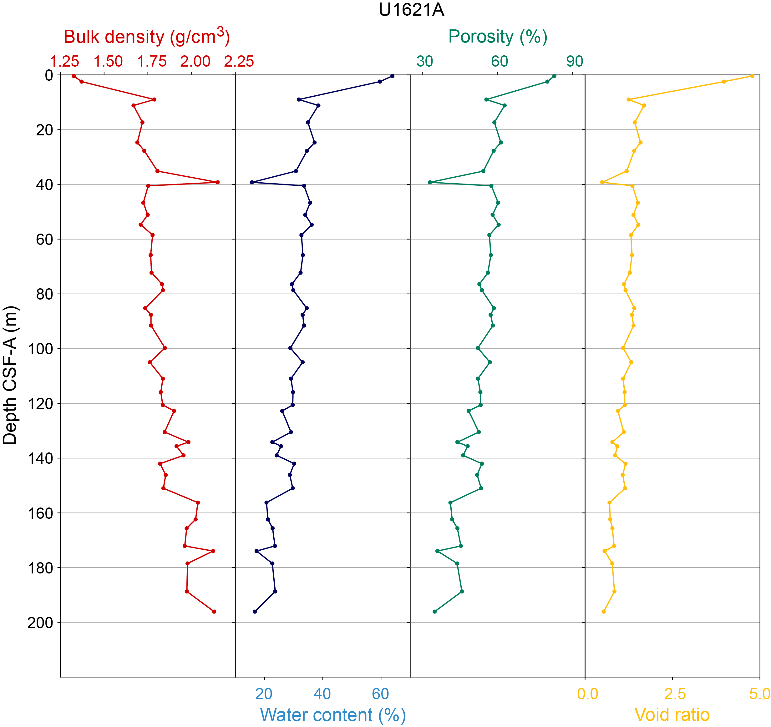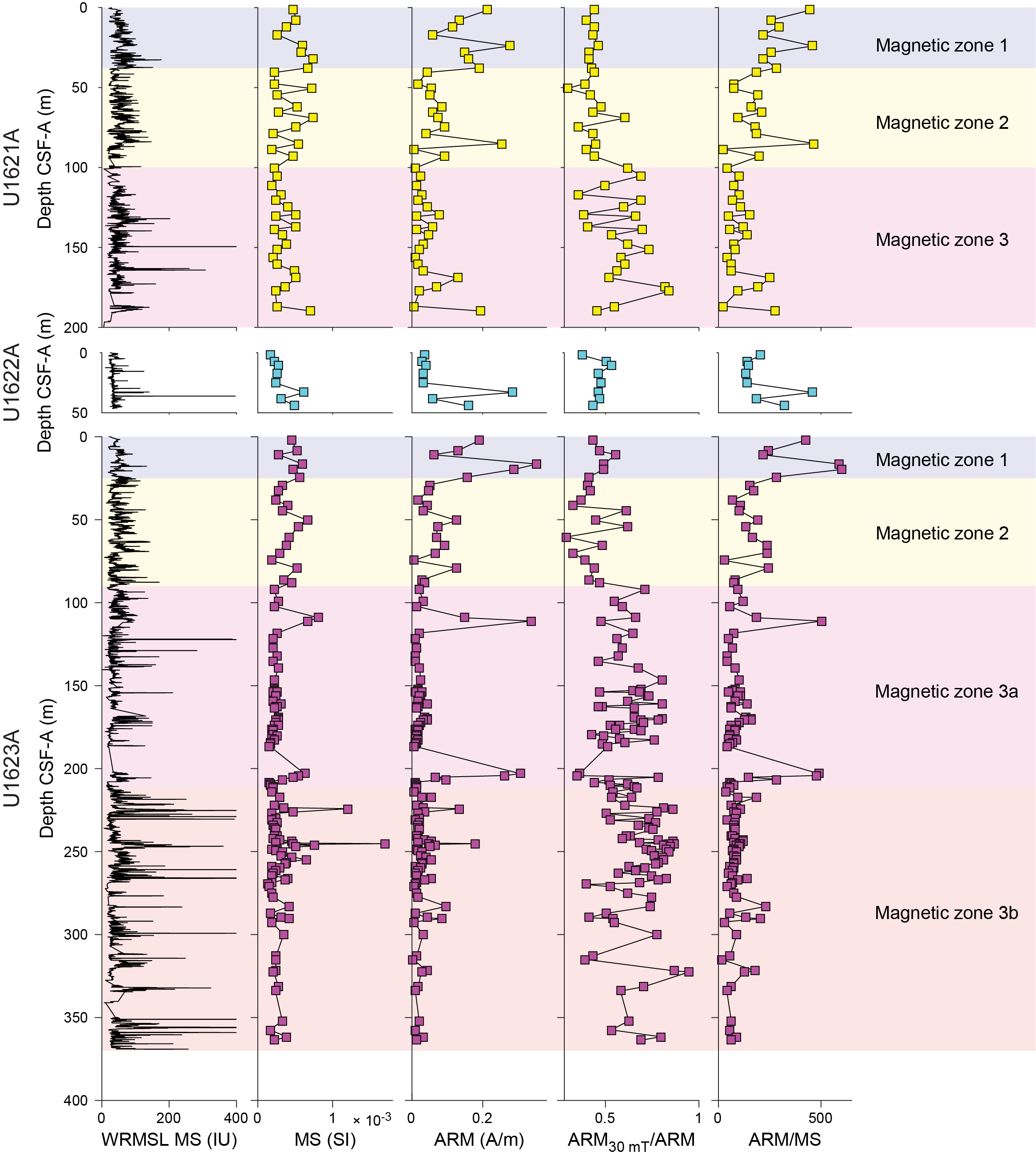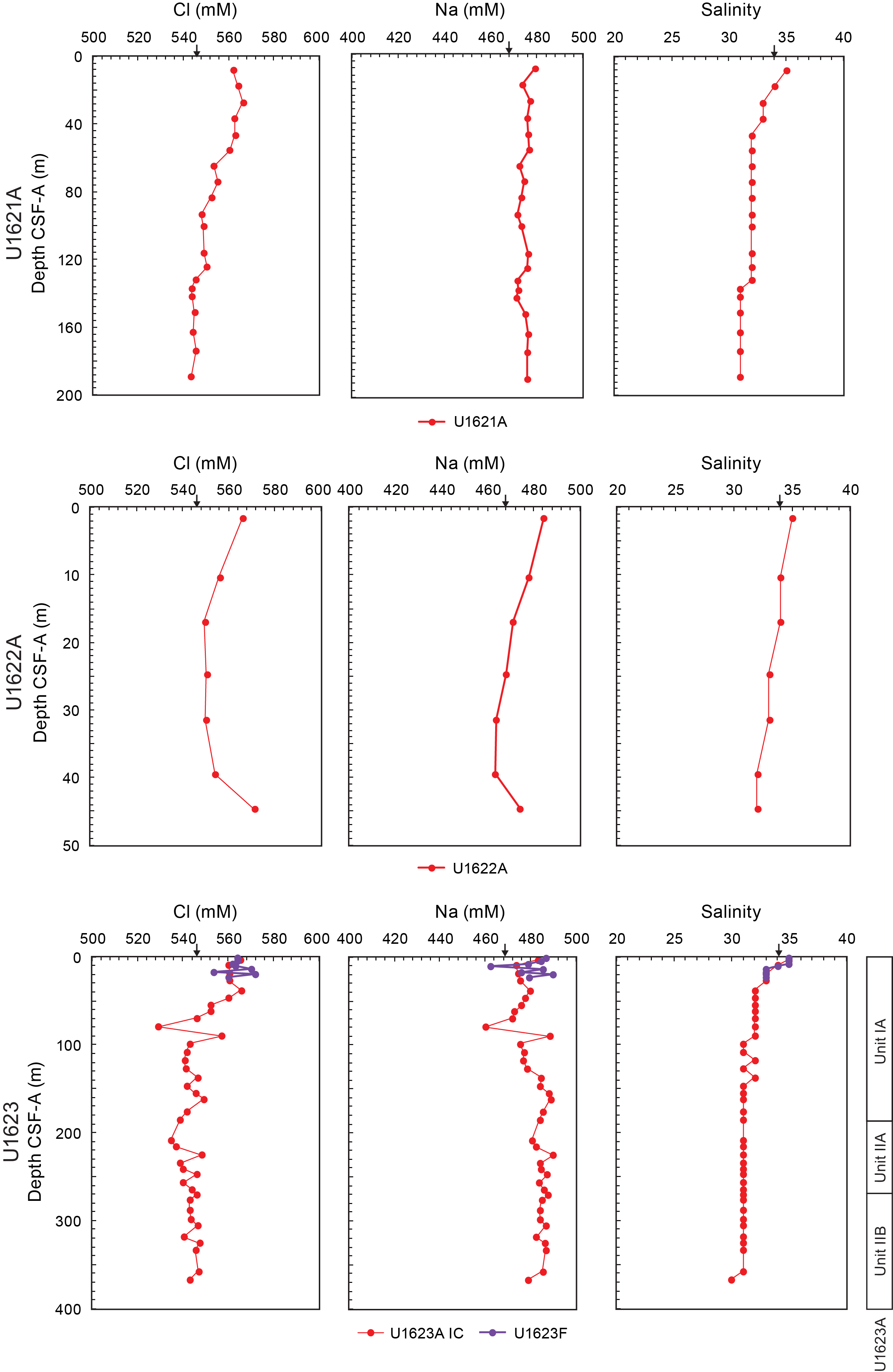 - Depths: Hole U1621A = 0–206.06 mbsf; Hole U1621B = 0–211.24 mbsf; Hole U1621C = 0–203.19 mbsf; Hole U1622A = 0–46.91 mbsf; Hole U1623A = 0–187.35 mbsf; Hole U1623C = 0–191.63 mbsf; Hole U1623D = 0–178.13 mbsf; Hole U1623F = 0–162.20 mbsf; Hole U1623G = 0–141.86 mbsf