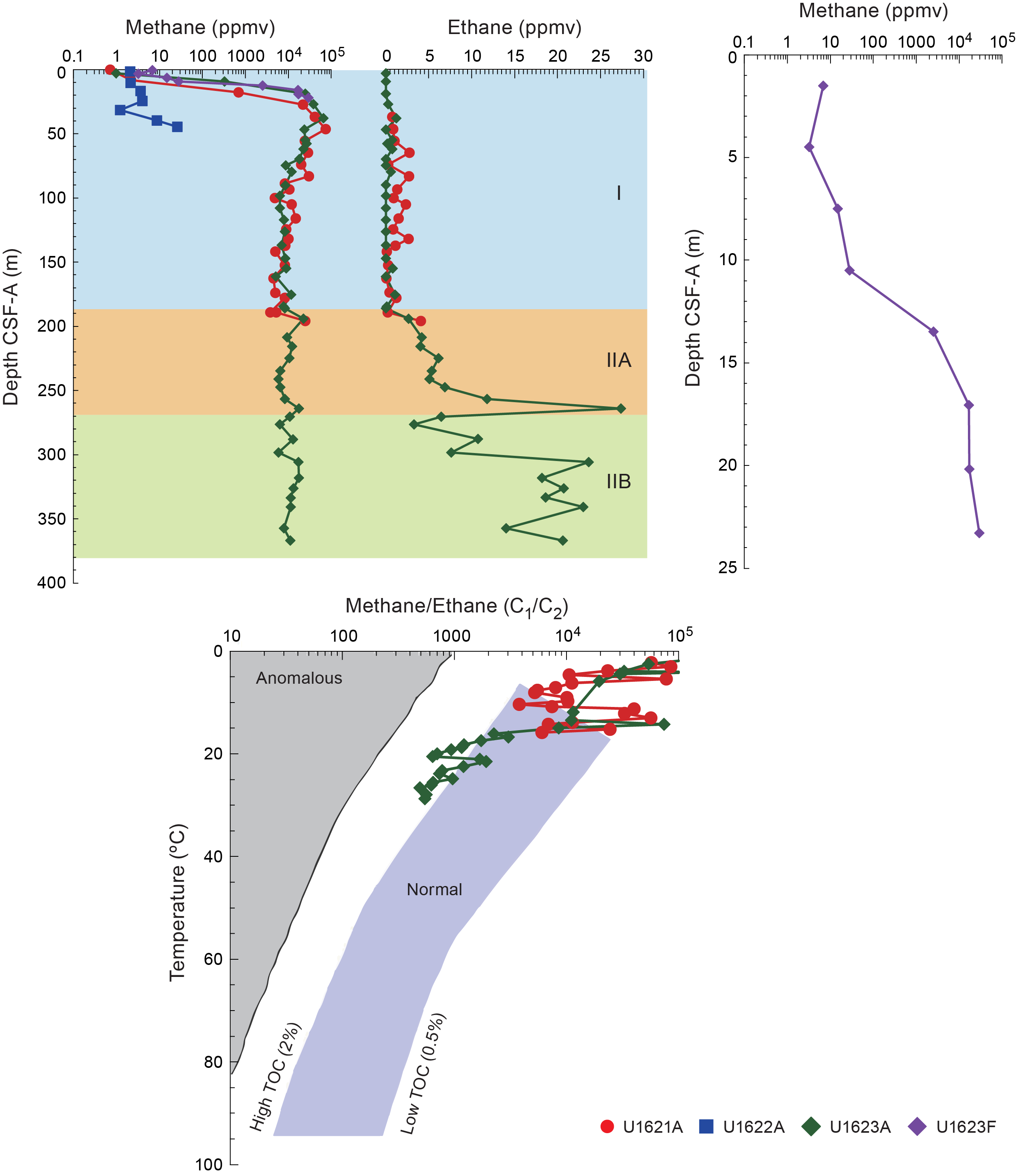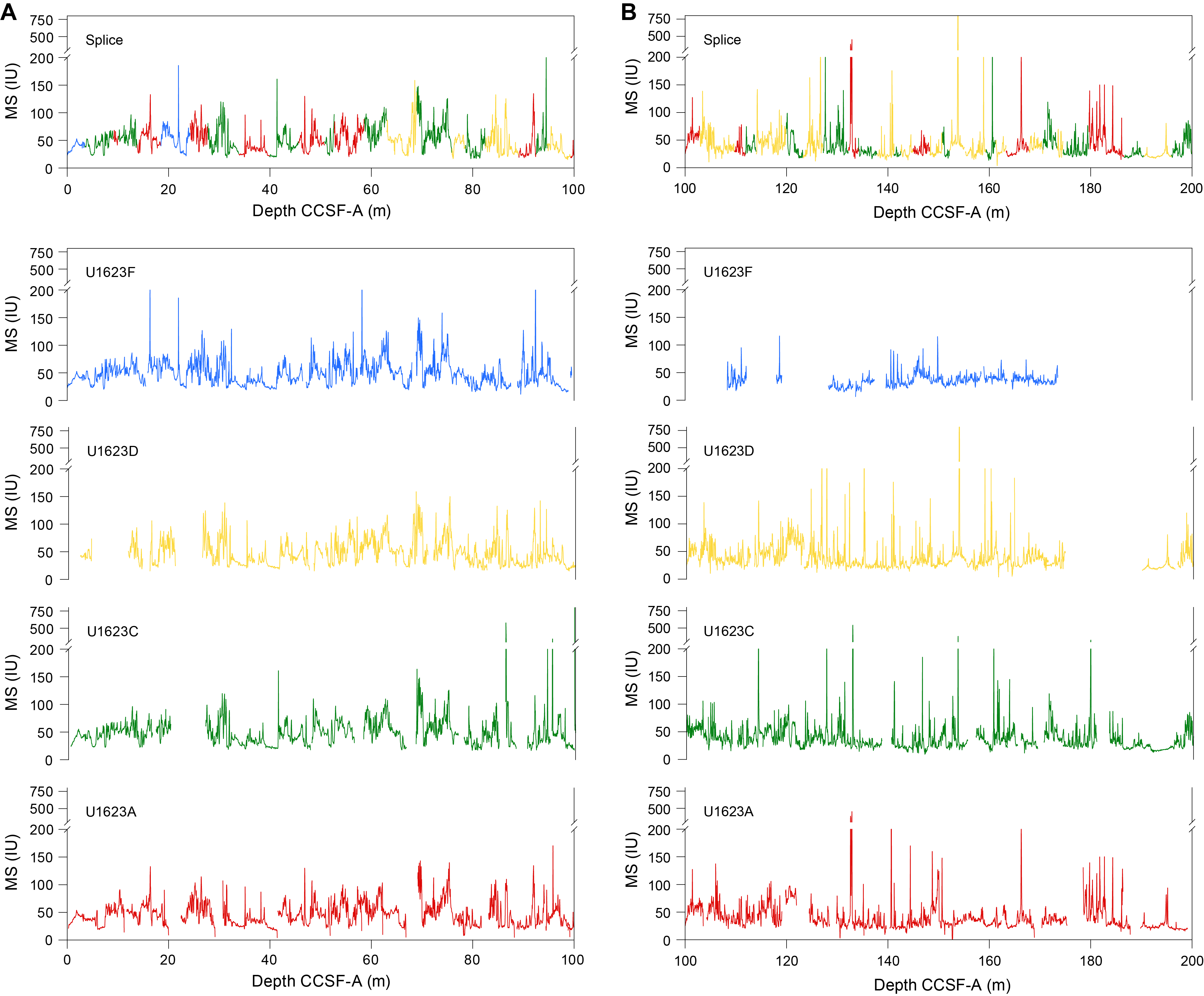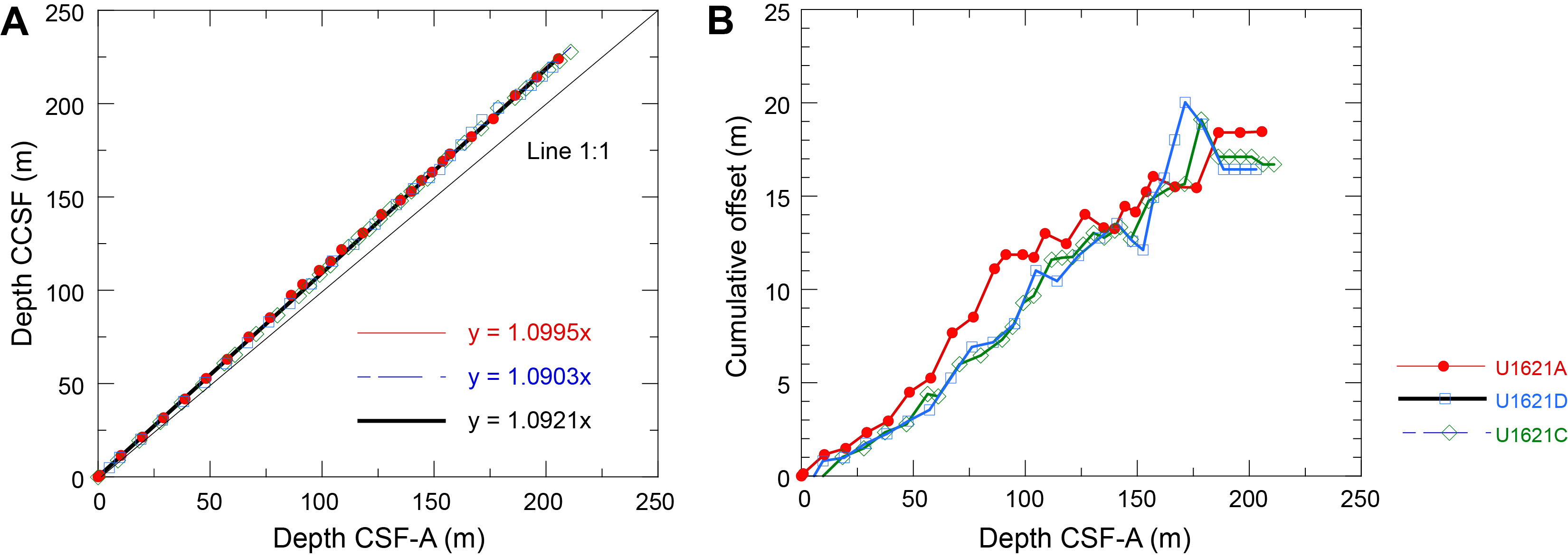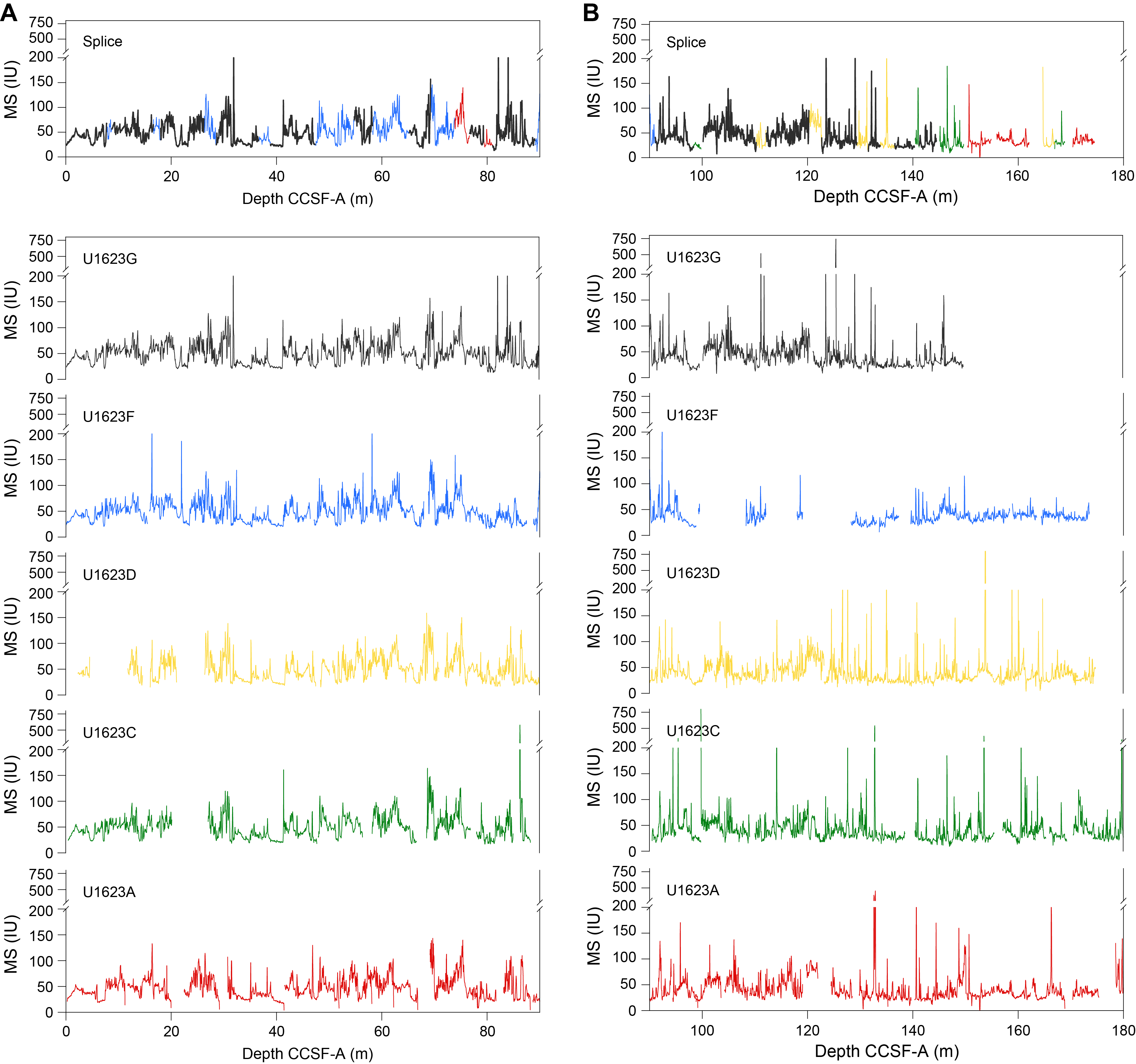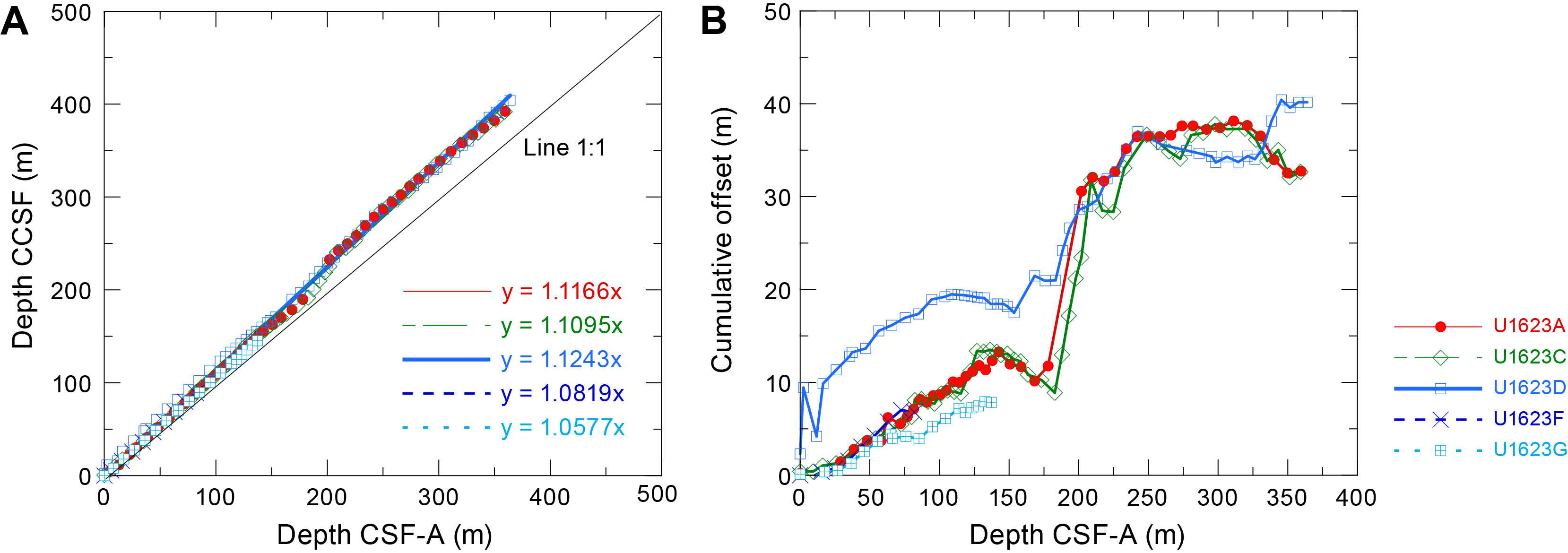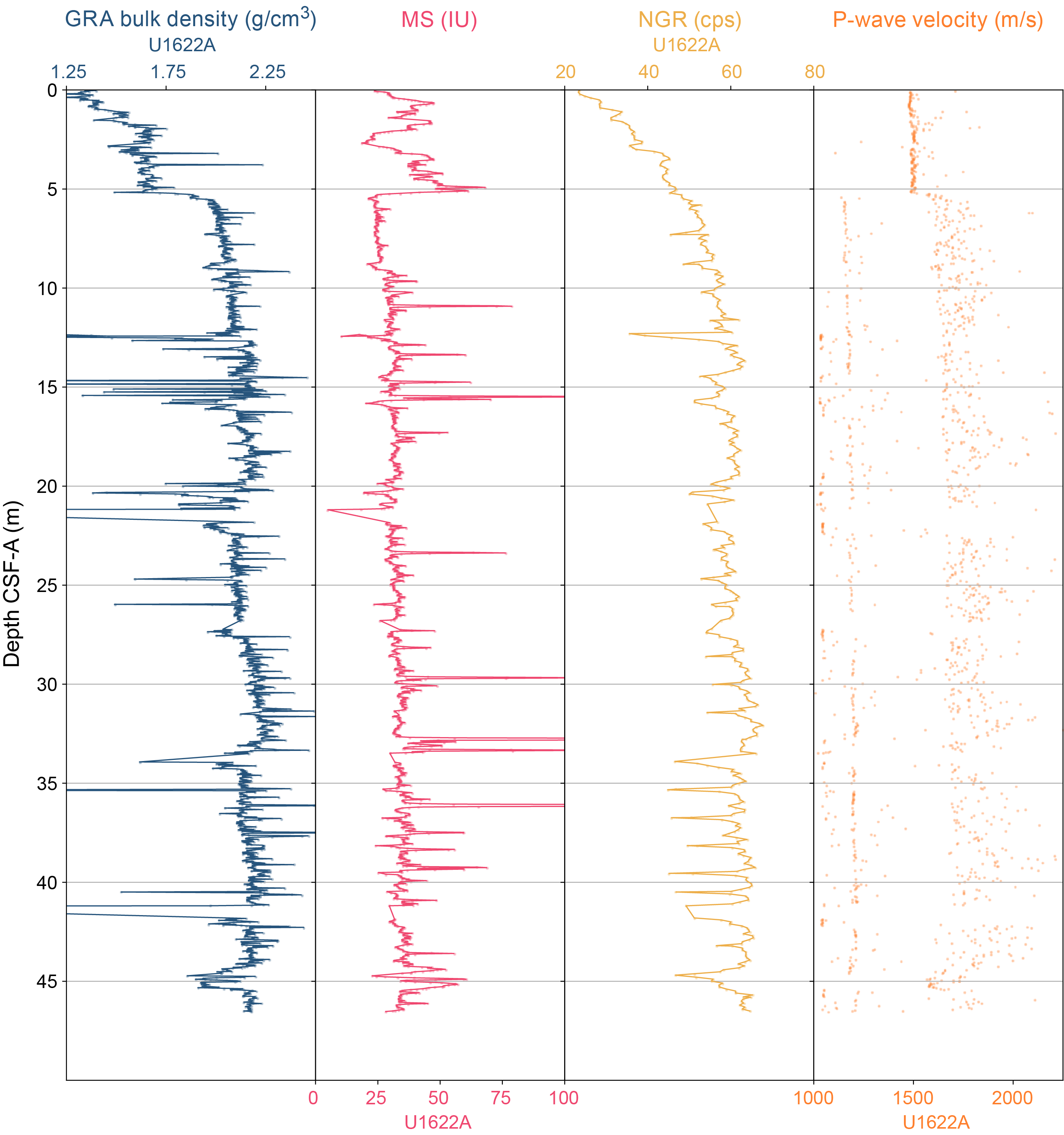 - Depths: Hole U1621A = 0–206.06 mbsf; Hole U1621B = 0–211.24 mbsf; Hole U1621C = 0–203.19 mbsf; Hole U1622A = 0–46.91 mbsf; Hole U1623A = 0–187.35 mbsf; Hole U1623C = 0–191.63 mbsf; Hole U1623D = 0–178.13 mbsf; Hole U1623F = 0–162.20 mbsf; Hole U1623G = 0–141.86 mbsf