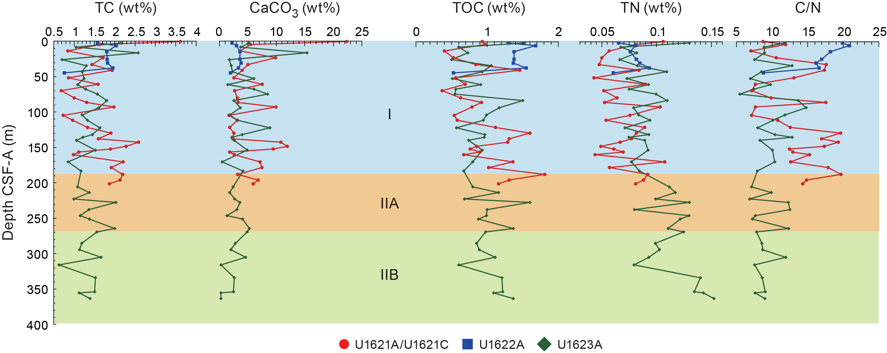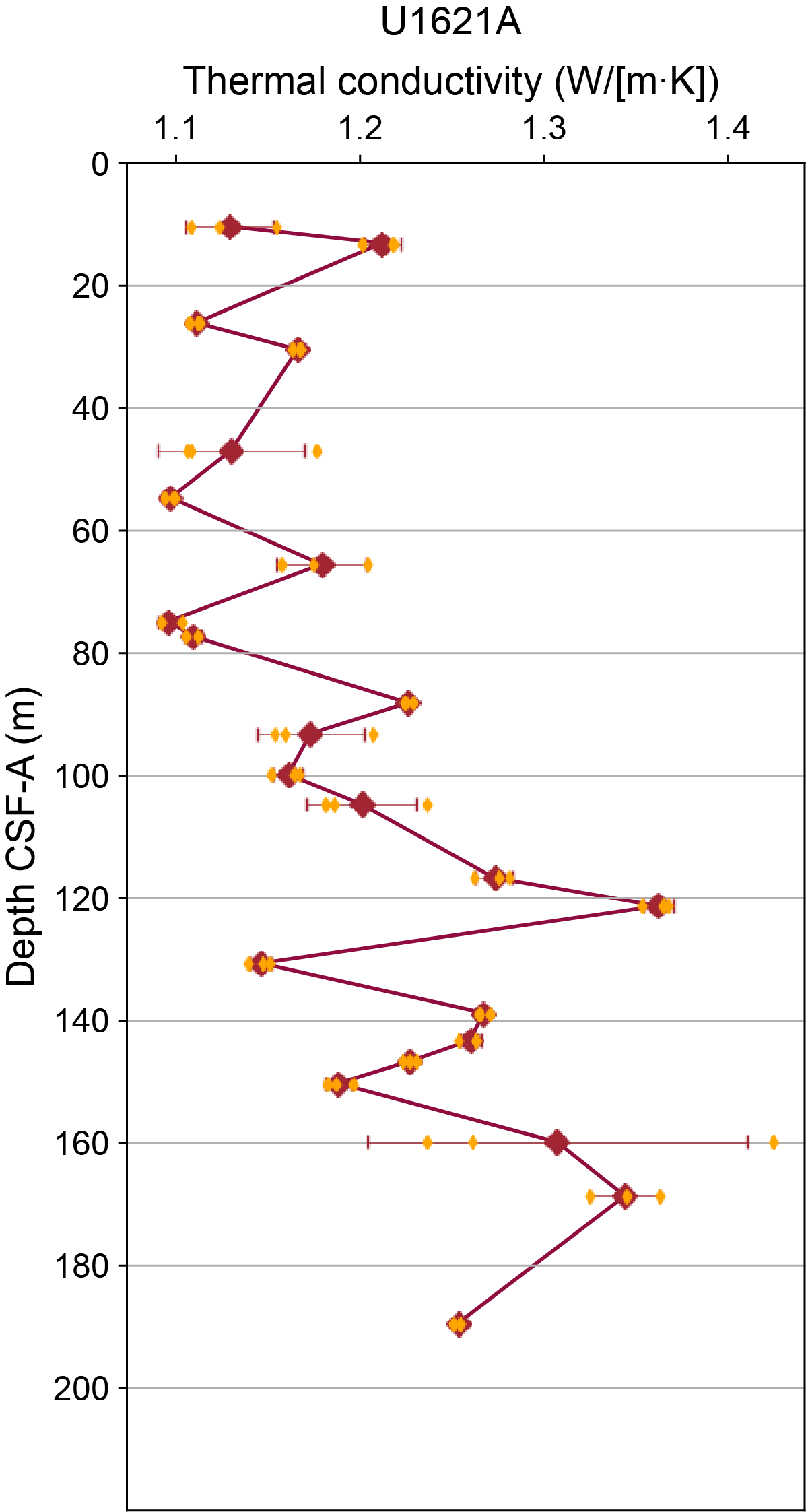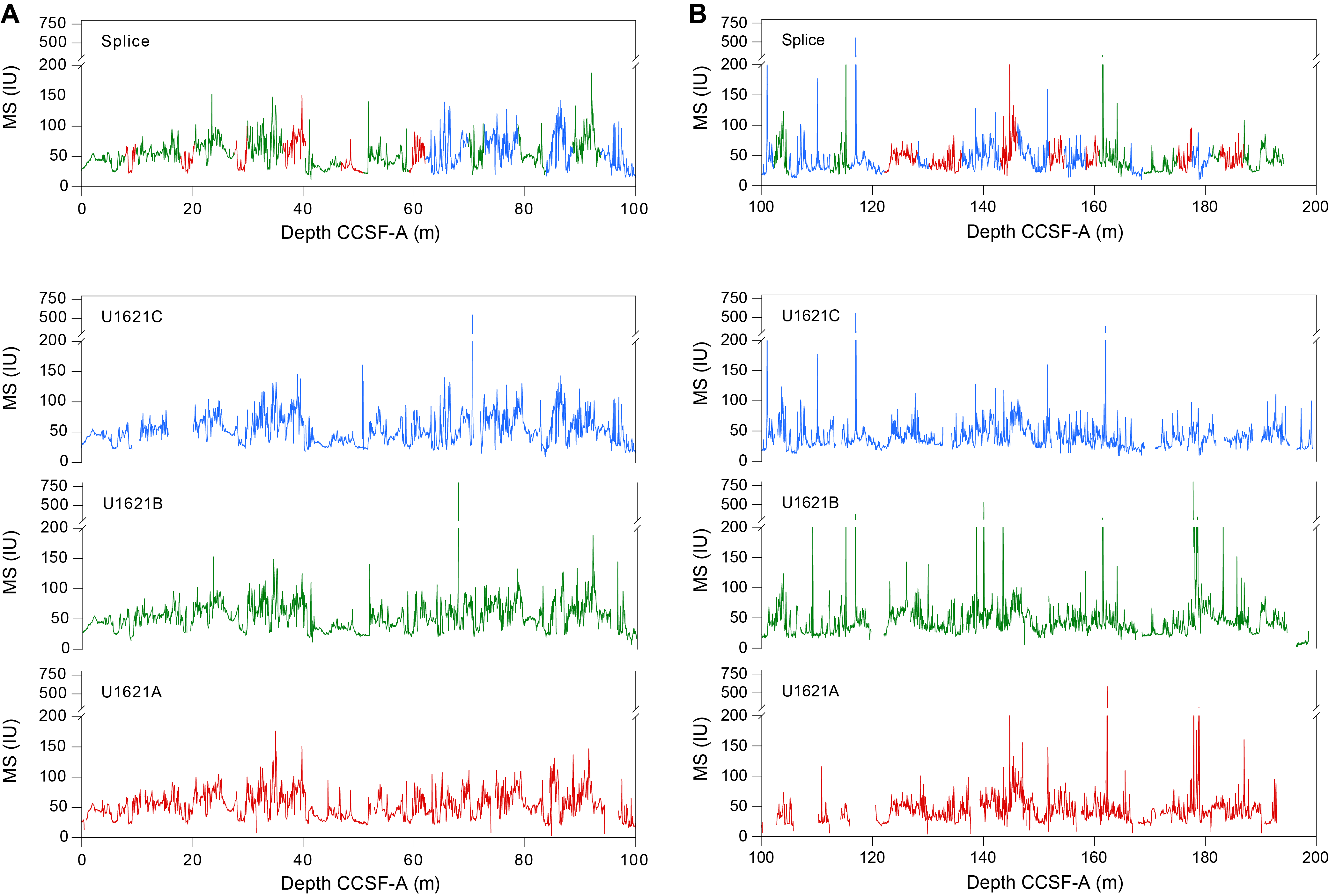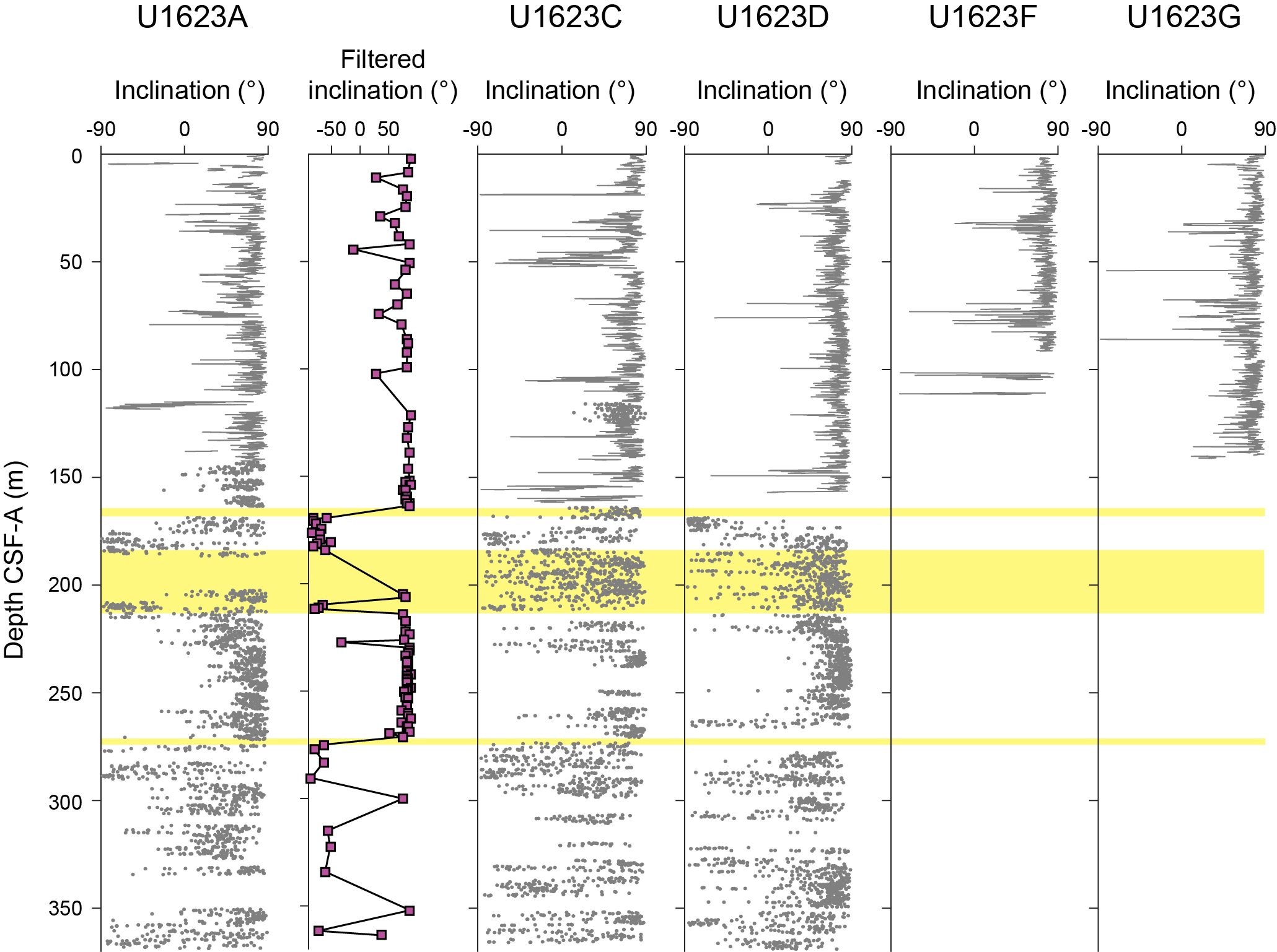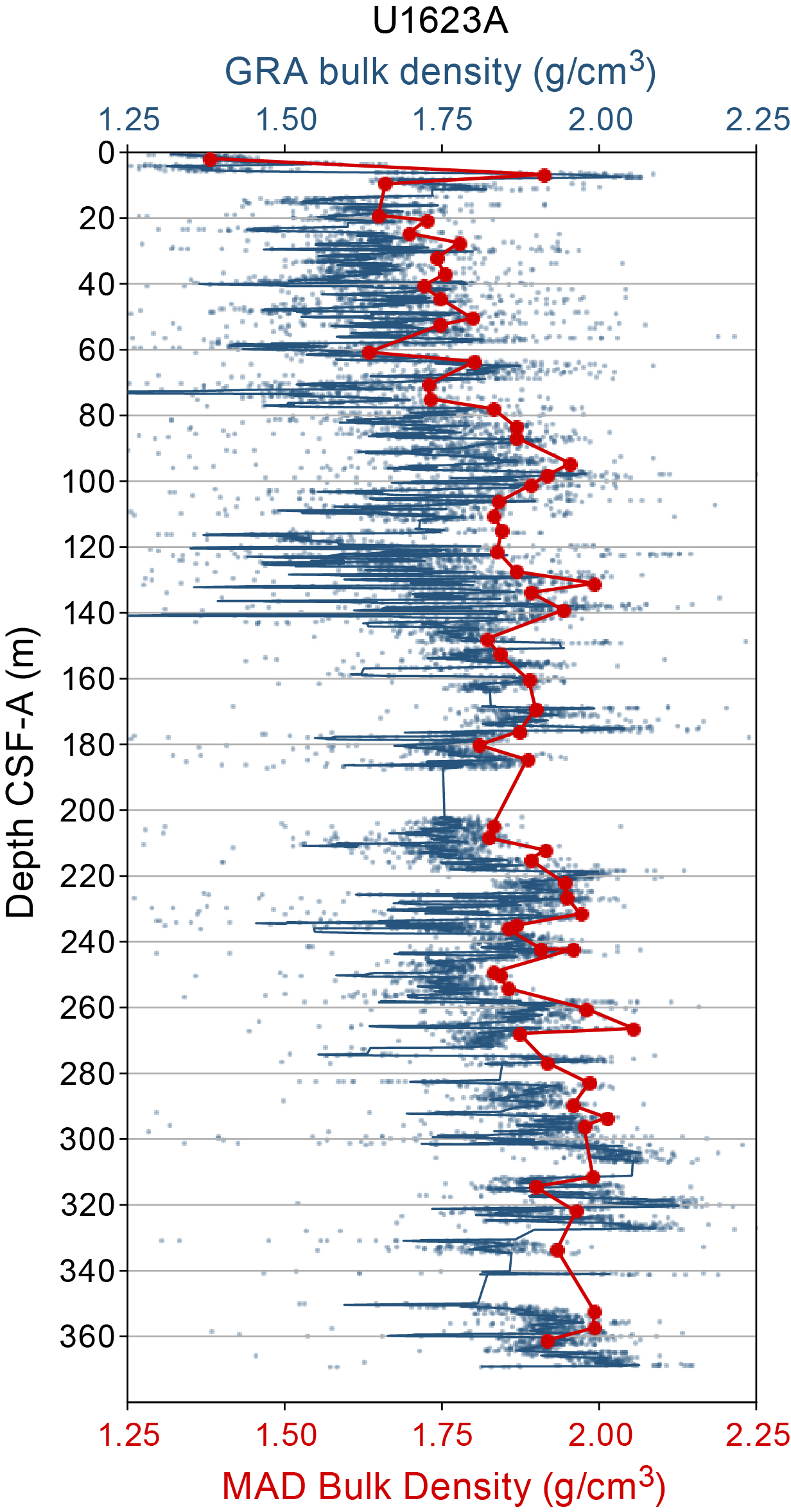- Depths: Hole U1621A = 0–206.06 mbsf; Hole U1621B = 0–211.24 mbsf; Hole U1621C = 0–203.19 mbsf; Hole U1622A = 0–46.91 mbsf; Hole U1623A = 0–187.35 mbsf; Hole U1623C = 0–191.63 mbsf; Hole U1623D = 0–178.13 mbsf; Hole U1623F = 0–162.20 mbsf; Hole U1623G = 0–141.86 mbsf