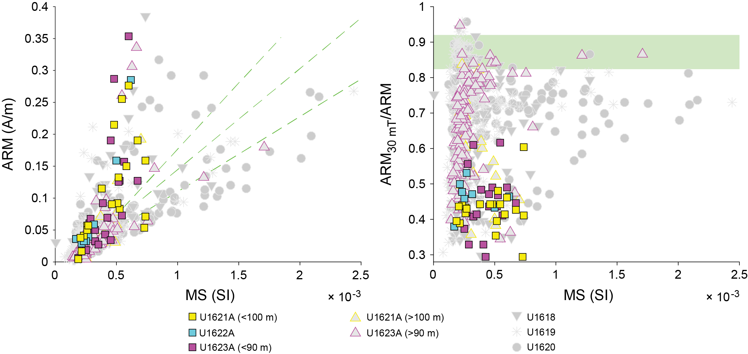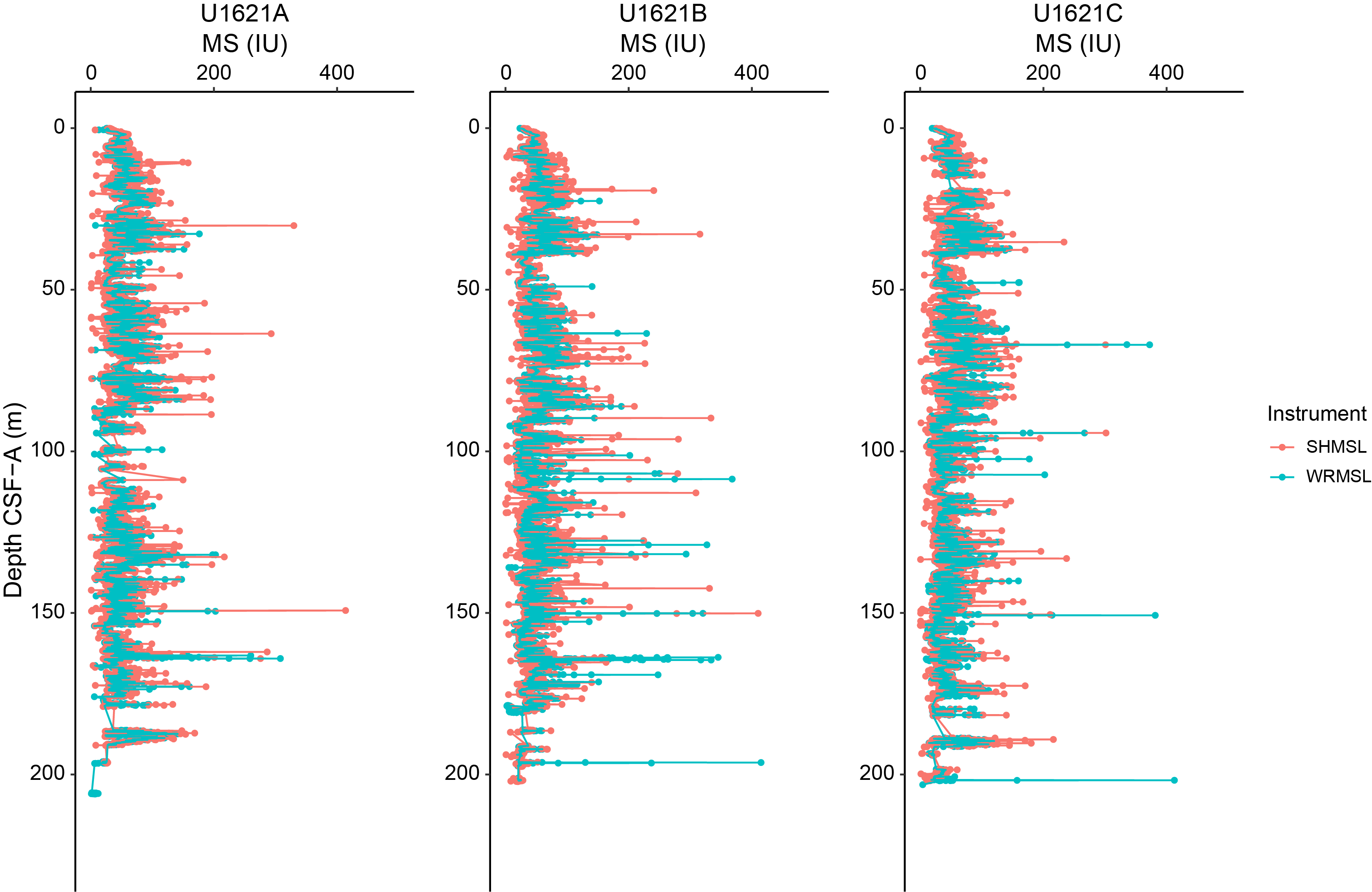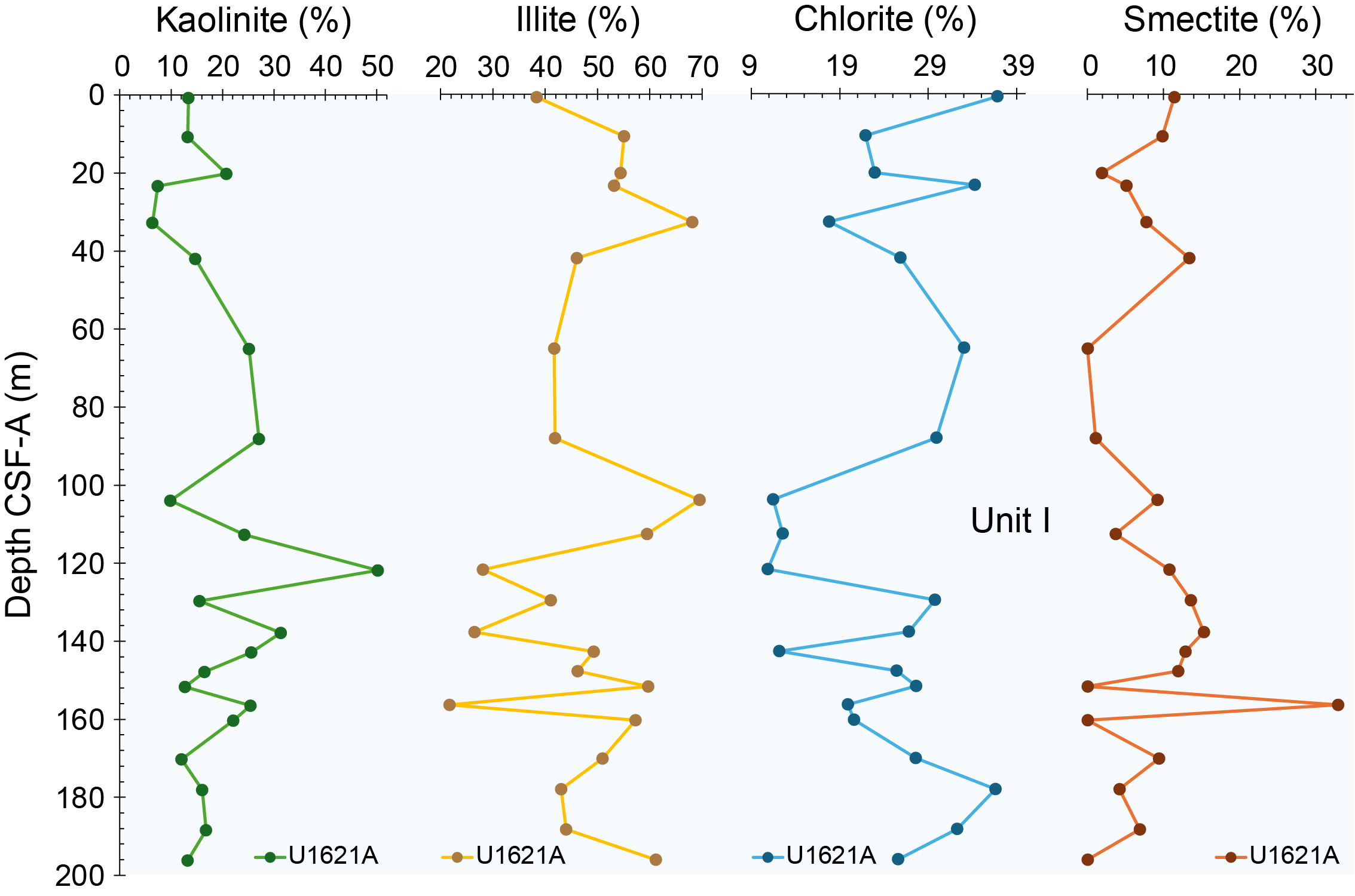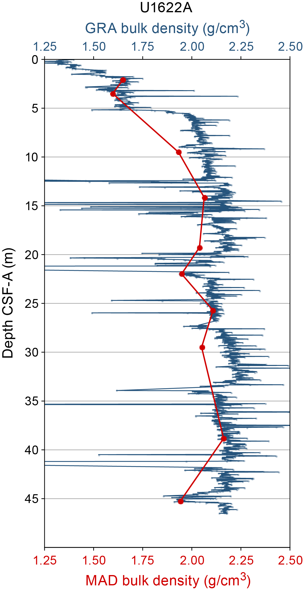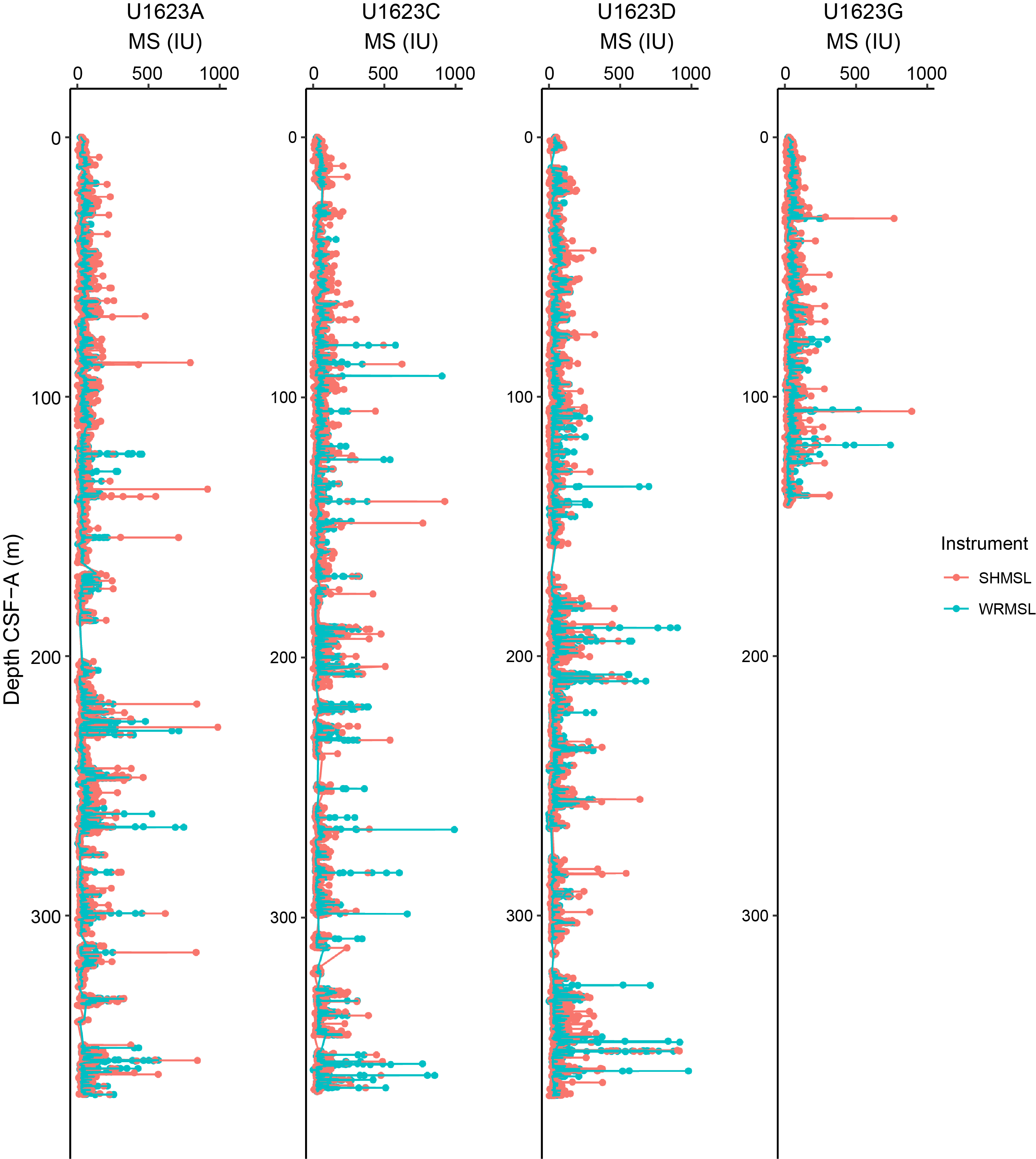 - Depths: Hole U1621A = 0–206.06 mbsf; Hole U1621B = 0–211.24 mbsf; Hole U1621C = 0–203.19 mbsf; Hole U1622A = 0–46.91 mbsf; Hole U1623A = 0–187.35 mbsf; Hole U1623C = 0–191.63 mbsf; Hole U1623D = 0–178.13 mbsf; Hole U1623F = 0–162.20 mbsf; Hole U1623G = 0–141.86 mbsf