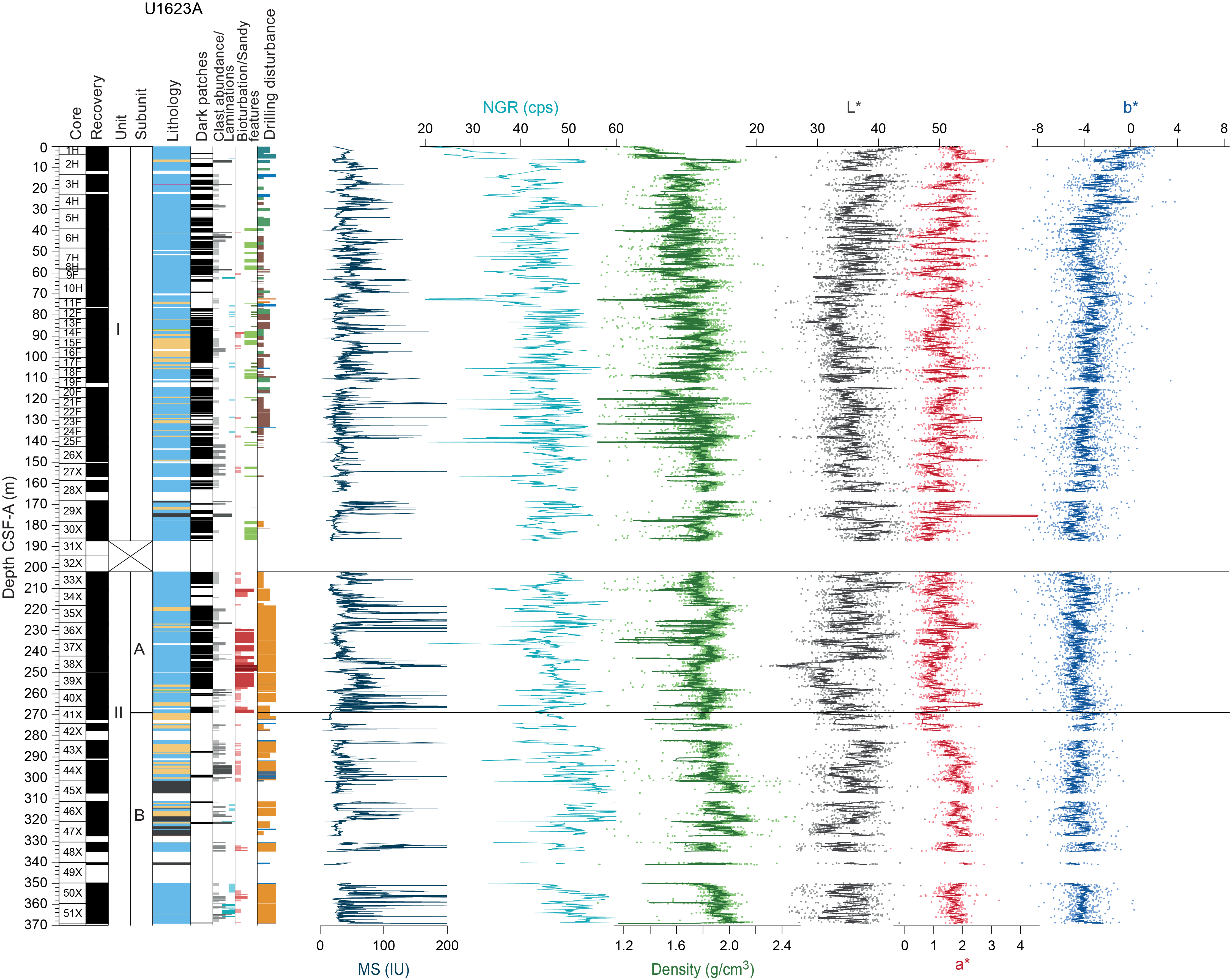 Based on the lithologic characteristics, sediments recovered from Sites U1621–U1623 are divided into two primary lithostratigraphic units and additional subunits (Figures F15, F16; Table T4). Hole U1623A was chosen as the primary site for subdivision, except between ~186 and 202 mbsf where there was poor core recovery; for this depth interval, Hole U1623C was used as the primary source for lithologic information.