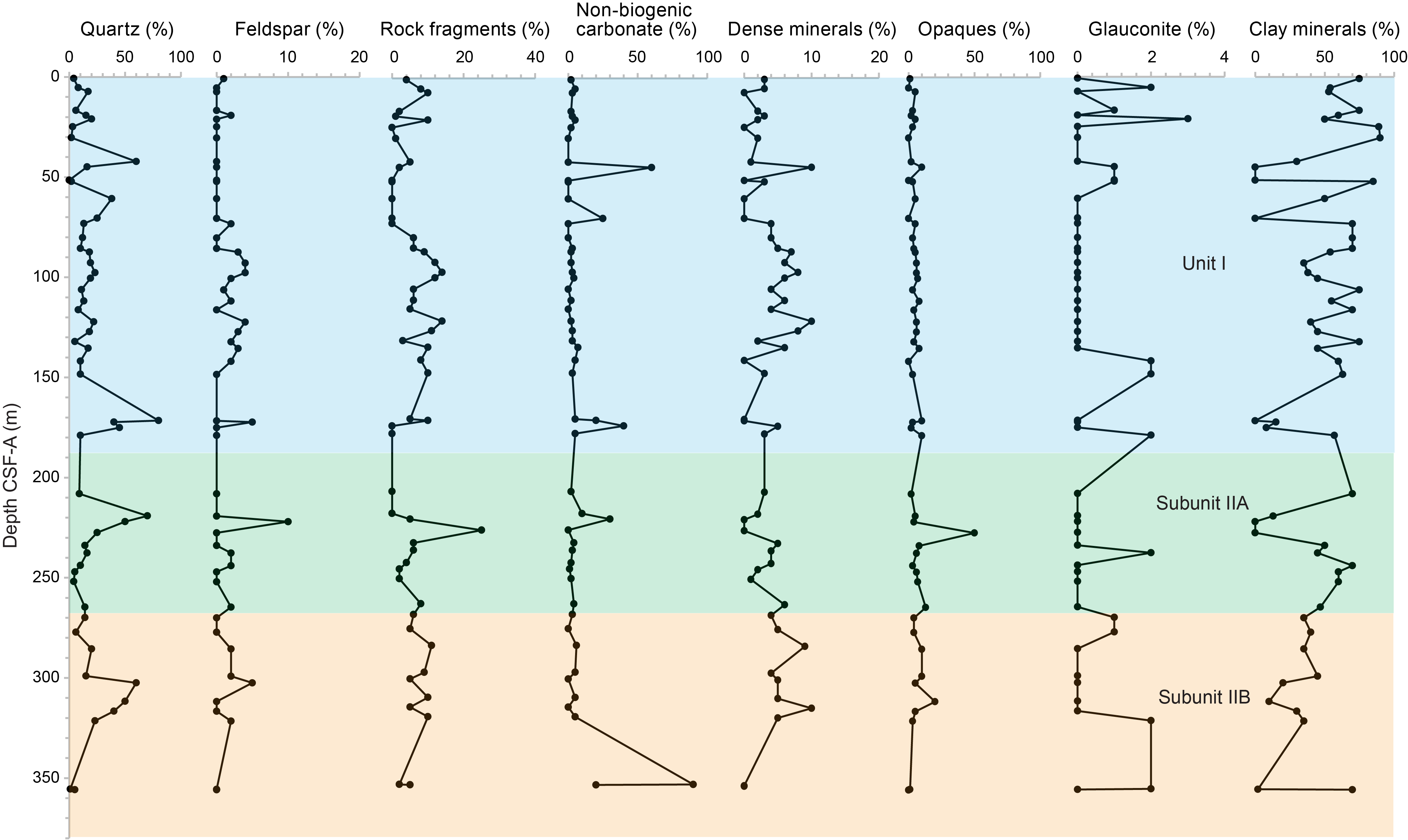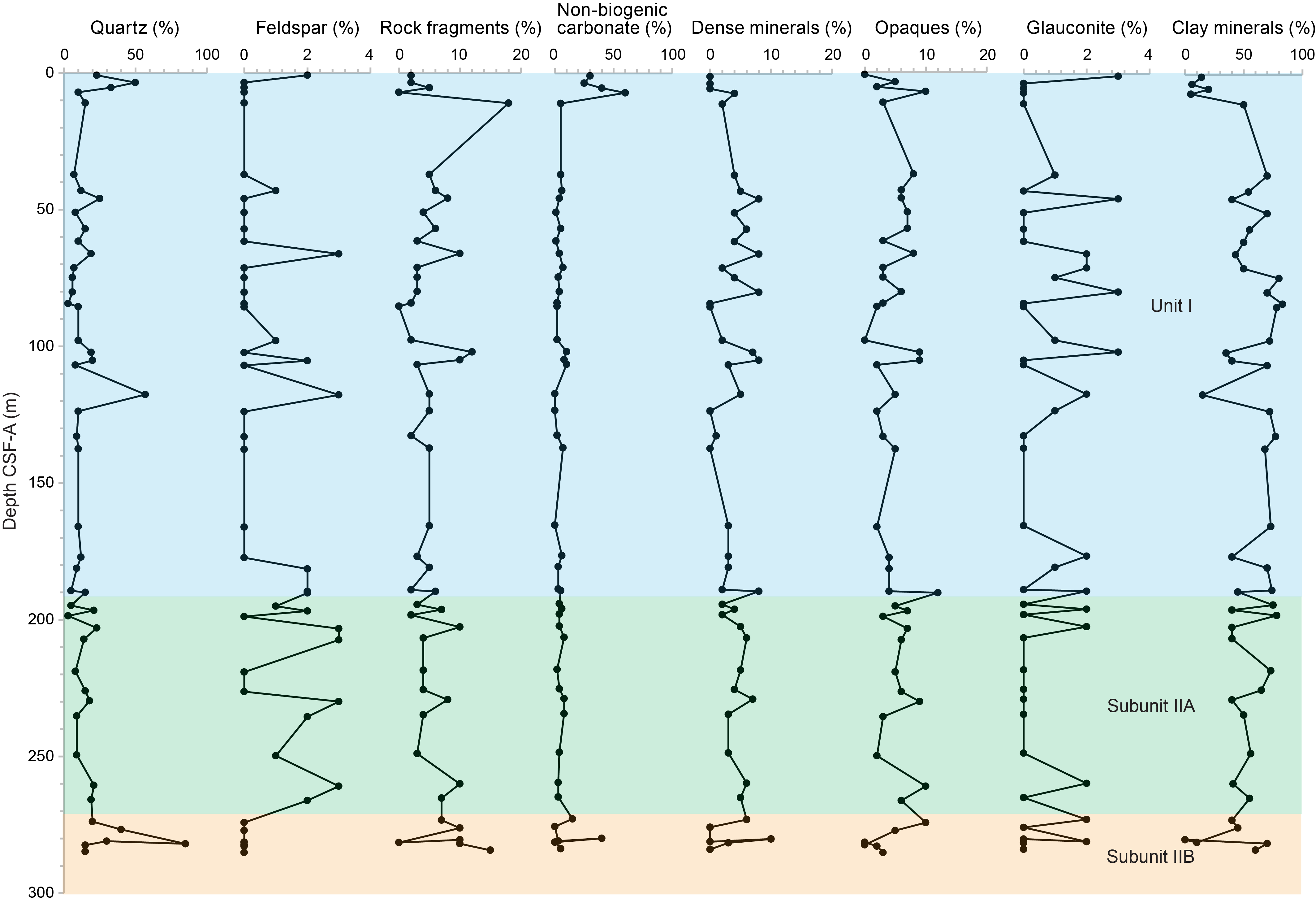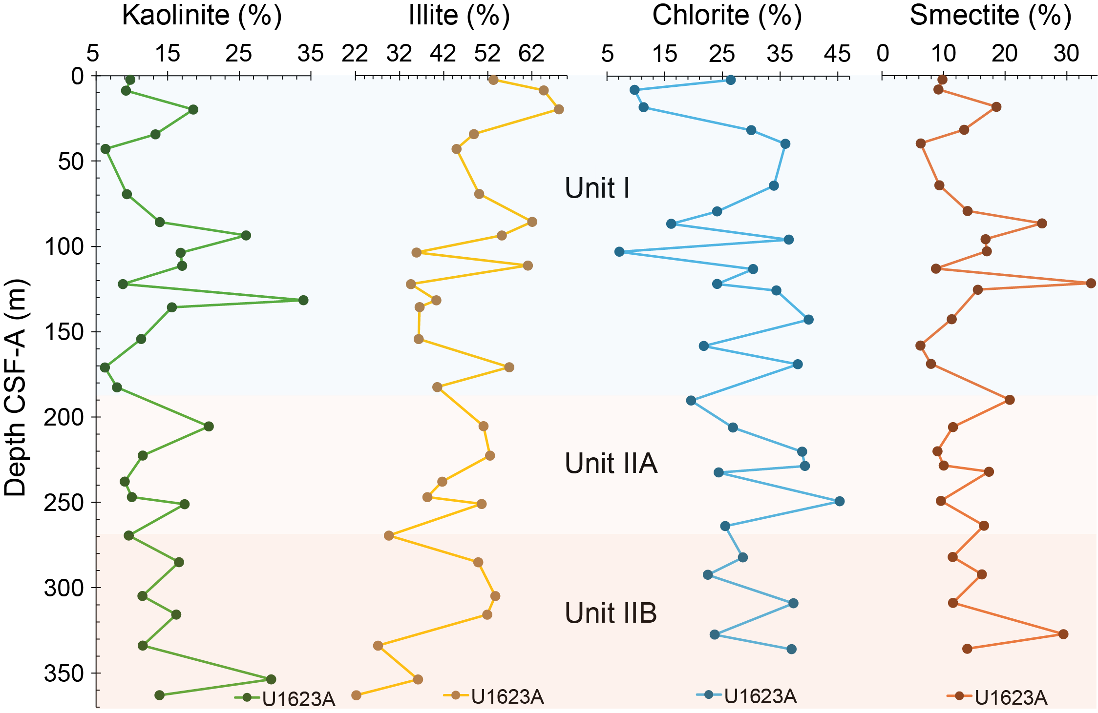 Below ~270 mbsf at Site U1623, most intervals show no apparent bioturbation or they are slightly to moderately bioturbated. Clast occurrence increases downhole toward ~300 mbsf, where silty clay matrix with abundant clasts transitions into diamicton for a thickness of ~40 m. Below ~340 mbsf, silty clays with dispersed to common clasts form the deepest part of the drilled sequence in Holes U1623A and U1623C, whereas in Hole U1623D, diamicton was encountered below ~360 mbsf.
