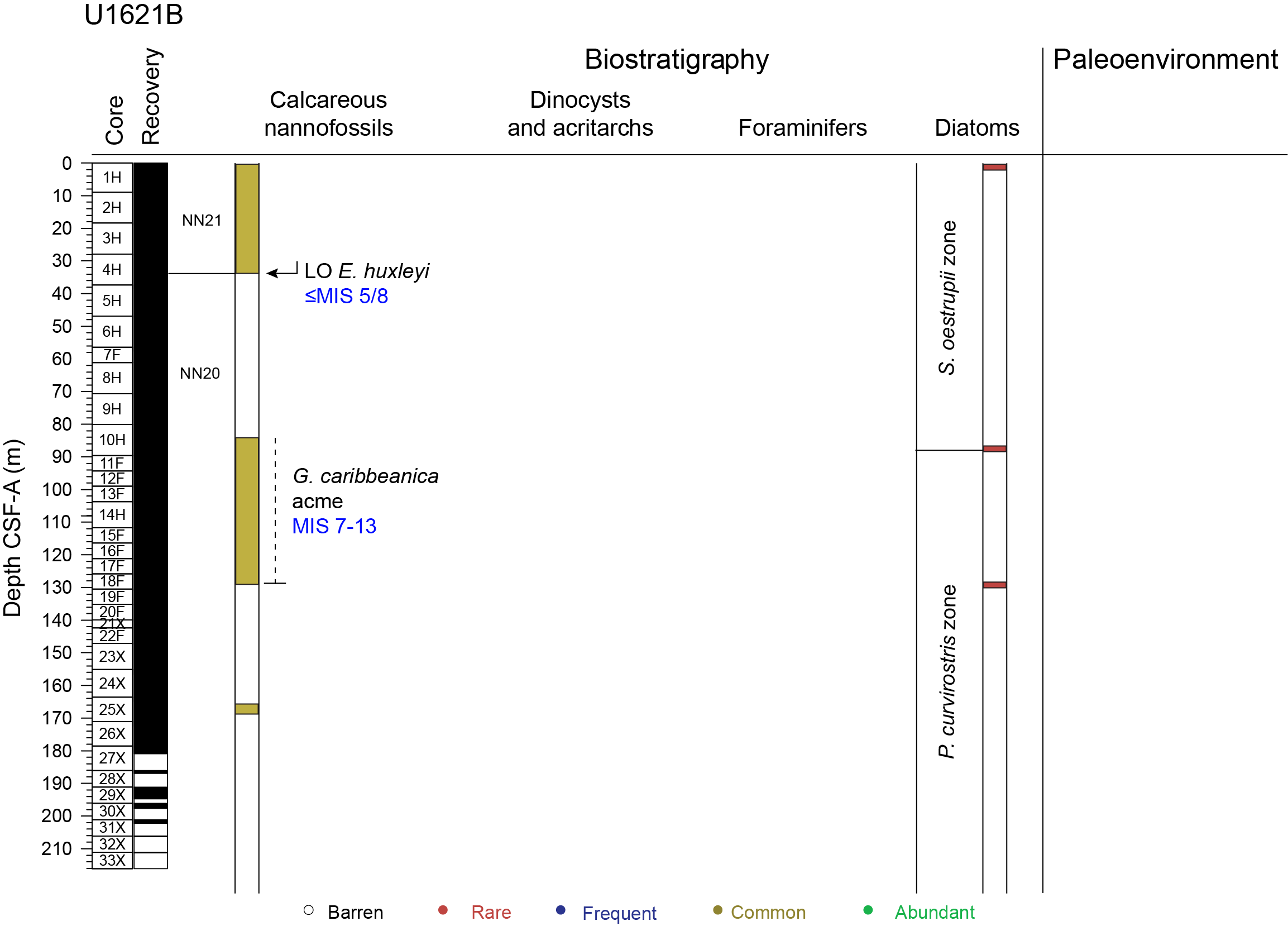 A total of 33 cores were taken over a 216.1 m interval, recovering 203.39 m of sediment (94%) (Table T1). The APC system was deployed for 10 cores over a 92.9 m interval with 98.16 m of recovery (106%); the HLAPC system was deployed for 11 cores over a 51.7 m interval with 55.23 m of recovery (107%); and the XCB system was deployed for 12 cores over a 71.5 m interval, recovering 50.00 m of sediment (70%). Nonmagnetic core barrels were used on all APC cores. Total time spent on Hole U1621B was 38.50 h (1.6 days).