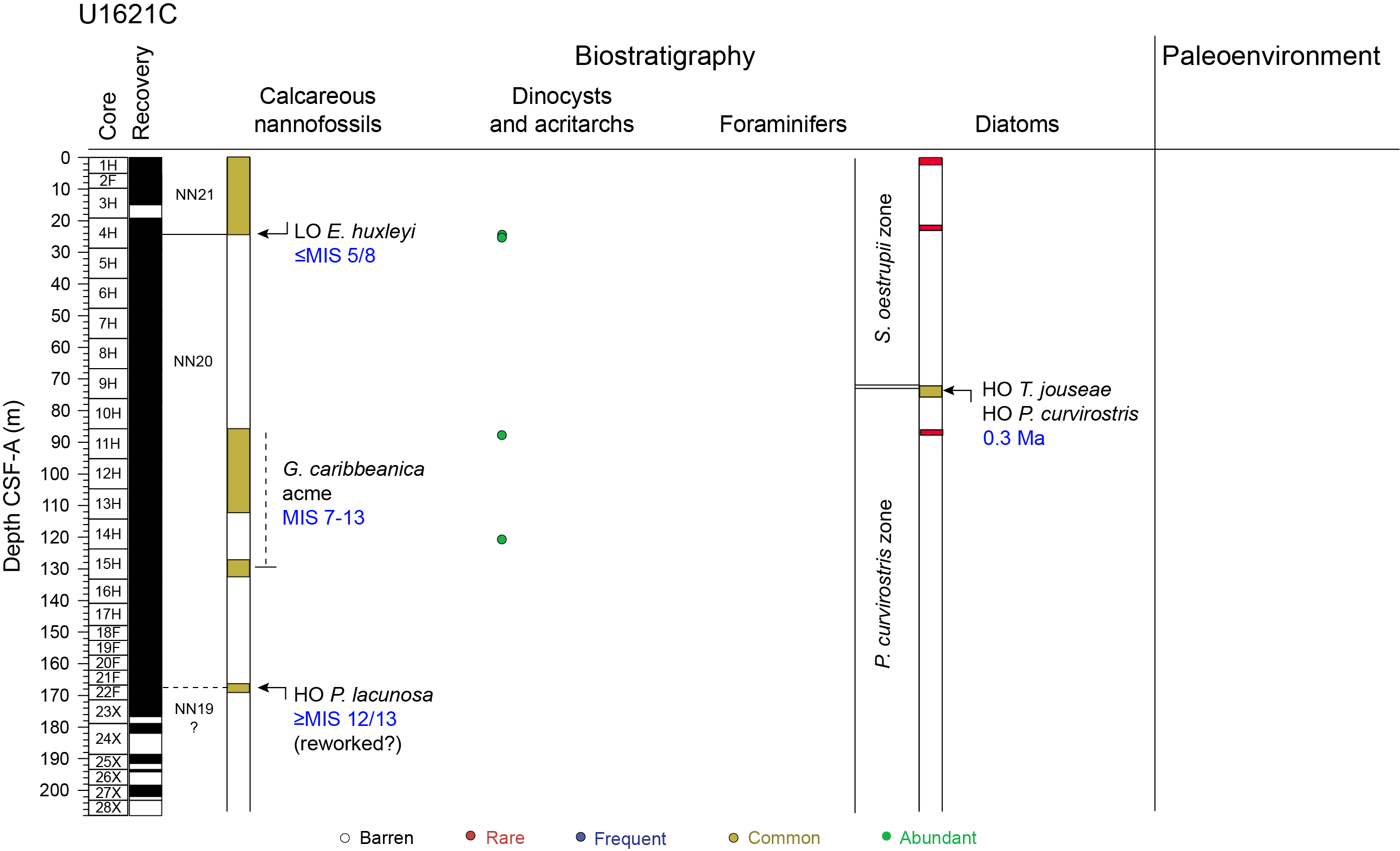 A total of 28 cores were taken over a 207.9 m interval, recovering 195.18 m of sediment (94%) (Table T1). The APC system was deployed for 16 cores over a 143.2 m interval with 148.5 m of recovery (104%); the HLAPC system was deployed for 6 cores over a 28.2 m interval with 30.90 m of recovery (110%); and the XCB system was deployed for 6 cores over a 36.5 m interval, recovering 15.83 m of sediment (43%). Nonmagnetic core barrels were used on all APC and HLAPC cores. A total of 30 h (1.3 days) were spent on Hole U1621C.