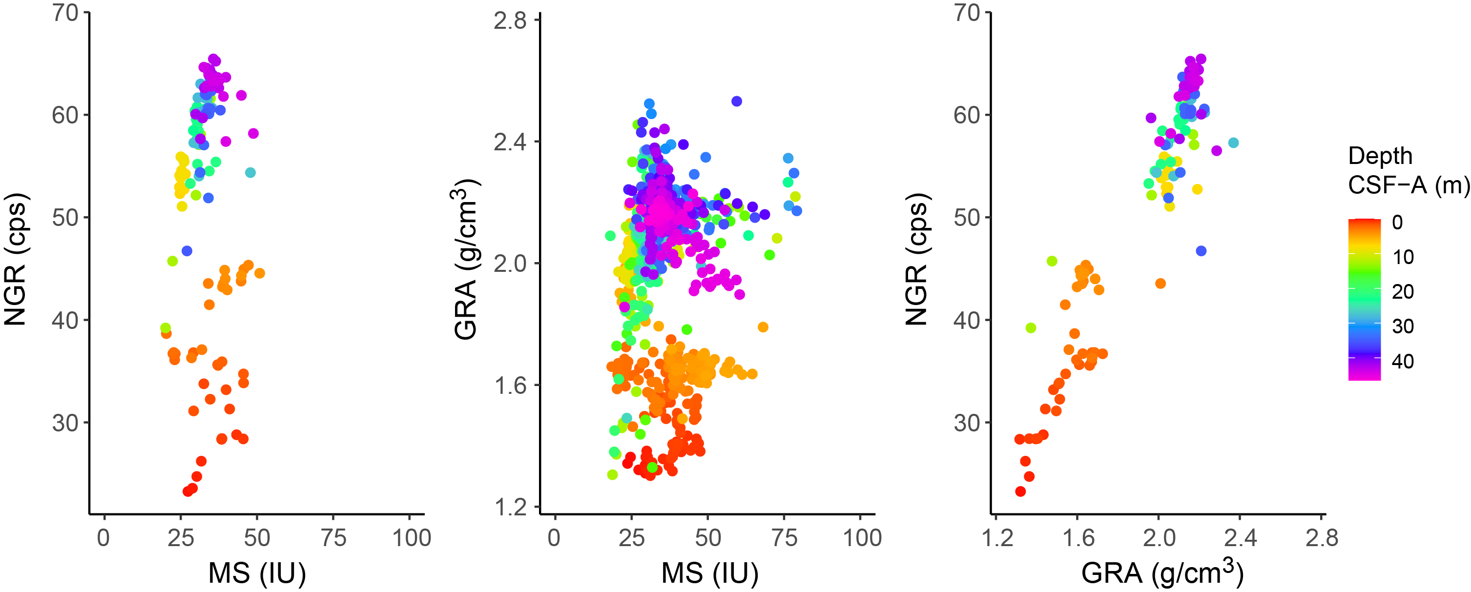 Logging data were sent for processing to the Lamont-Doherty Earth Observatory (LDEO; Columbia University, USA) (Figure F83; Table T24). The data provide important information for core-log integration to understand the actual depth and thickness of each lithostratigraphic unit because some cores at this site suffered from gas expansion.