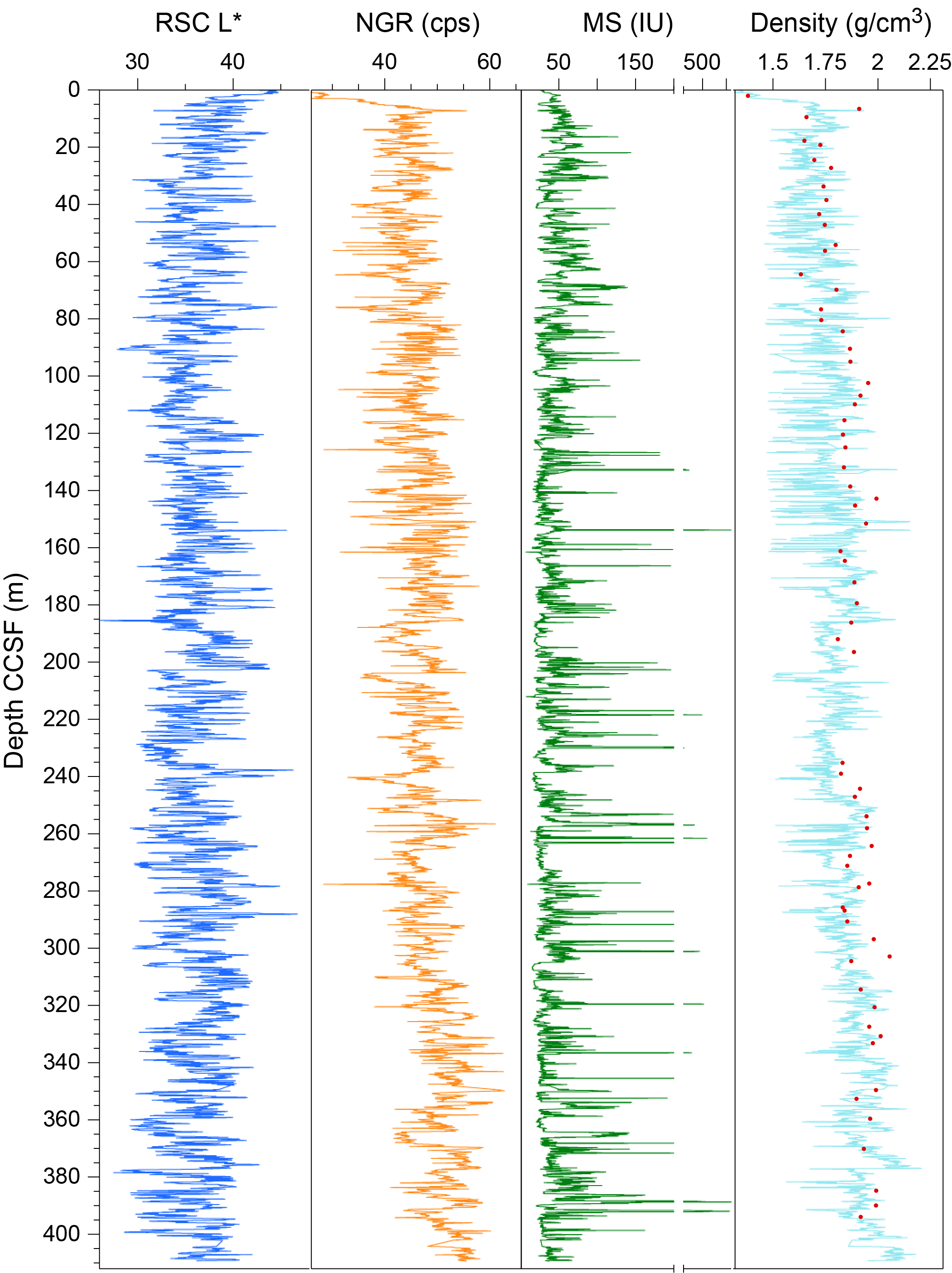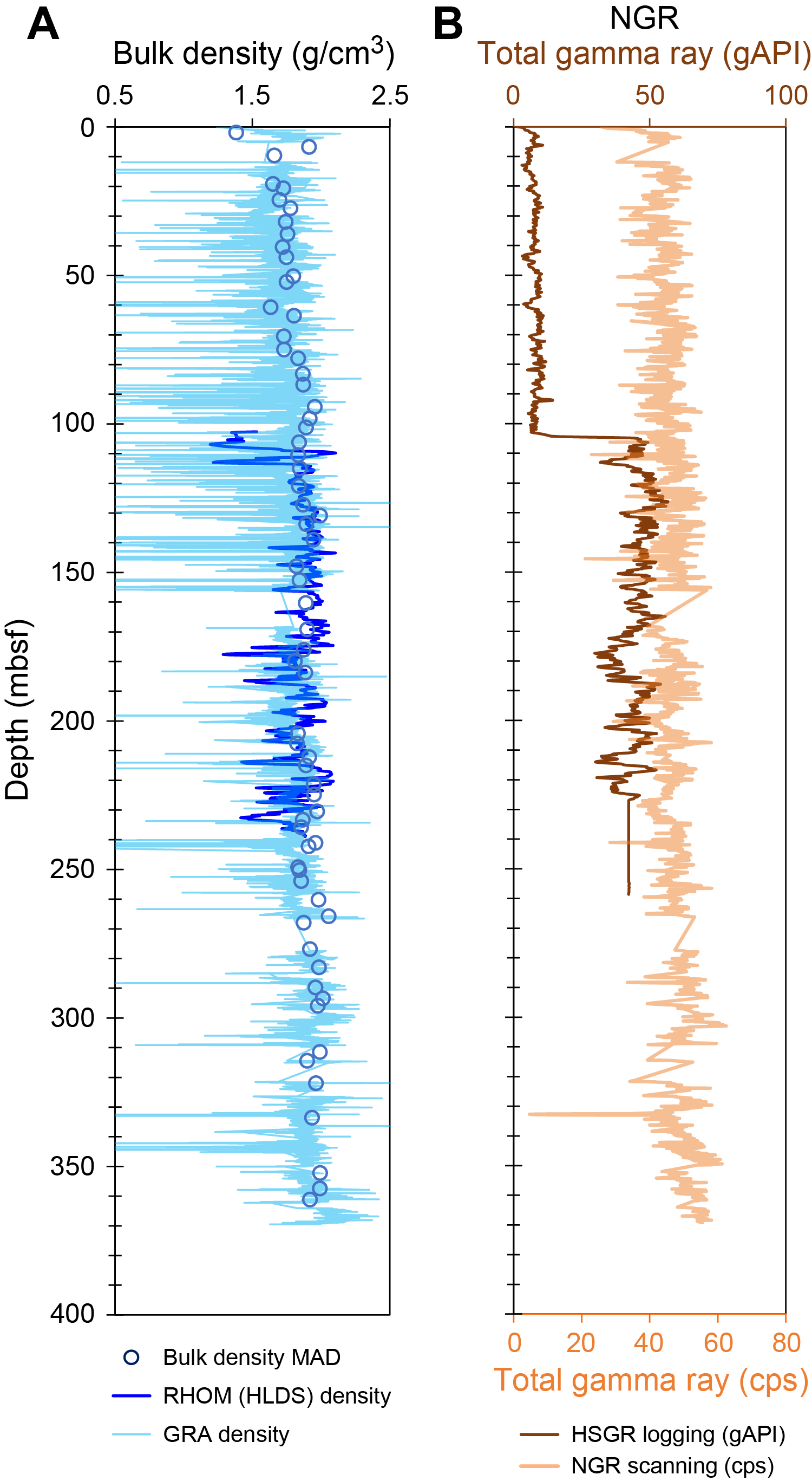 Natural gamma ray and density showed almost the same trends as the shipboard scanning data. HLDS density log measurements from 105.1 to 239.0 m WMSF (below the drill pipe) are on average 1.84 g/cm3 and do not show a significant downhole trend. Although a lot of anomalies due to bad contact of the HLDS probe with an enlarged borehole wall were observed, otherwise absolute values of the HLDS density measurements were very similar to densities derived from discrete MAD measurements. HLDS logging showed cyclic density changes, but the variability was much smaller than for the GRA bulk density in shallower intervals (105 to ~160 m WMSF), probably due to frequent gas expansion of cores. Mean density values of HLDS logging and GRA density are similar (Figure F84A).