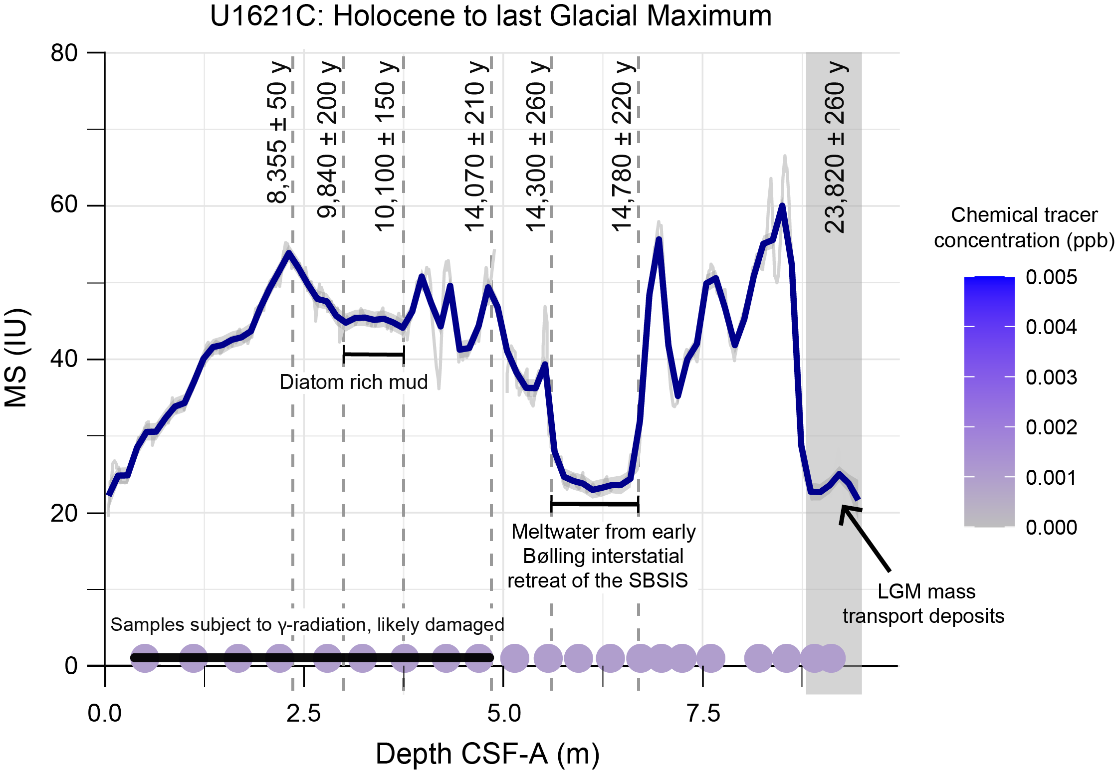 Piston core work in this area demonstrates that the Bellsund drift is an excellent setting to recover continuous, expanded, and datable sedimentary sequences for detailed paleoclimatic and paleoceanographic analyses. The 2014 Eurofleets2-PREPARED project (Lucchi et al., 2014) recovered a long Calypso piston core from the Bellsund drift that contains a continuous, very expanded paleoclimatic record spanning the last 40 ky with up to subcentennial resolution. A robust age model was defined through paleomagnetic and biostratigraphic analyses, the identification of tephras, and radiocarbon dating of the abundant biogenic carbonate fraction (Caricchi et al., 2019, 2020). The sedimentologic analyses indicate the consistent presence of contouritic deposition and the existence of short-lived, abrupt depositional events associated with prominent meltwater events, including the MWP-1A (Lucchi et al., 2013, 2015); the MWP-1A0 (Caricchi et al., 2019), also known as MWP-19ka (Yokoyama et al., 2000, Clark et al., 2004); and Heinrich-like events indicating a highly dynamic paleo-SBSIS during the last 60 ky (Lucchi et al., 2018; Caricchi et al., 2019).