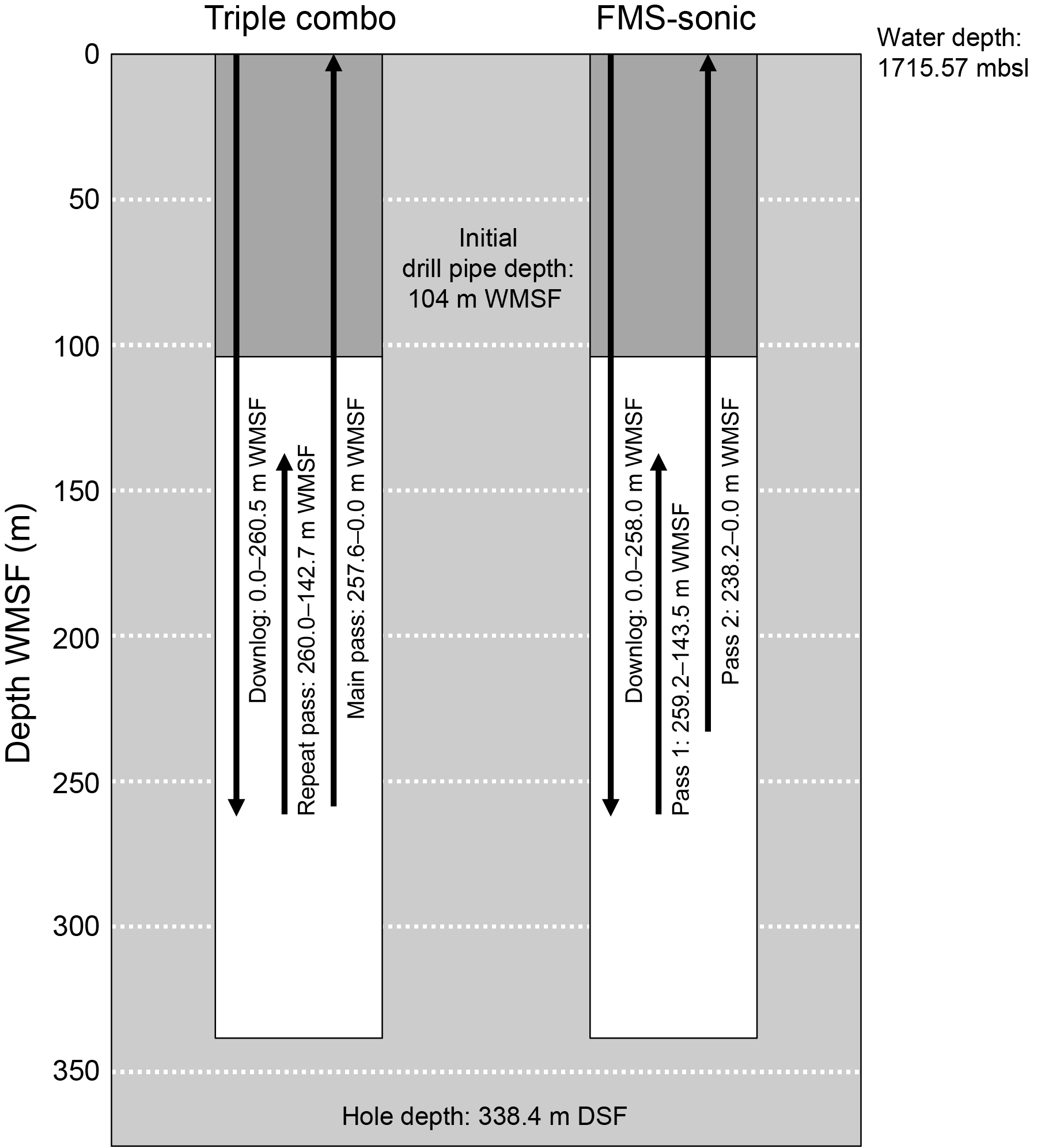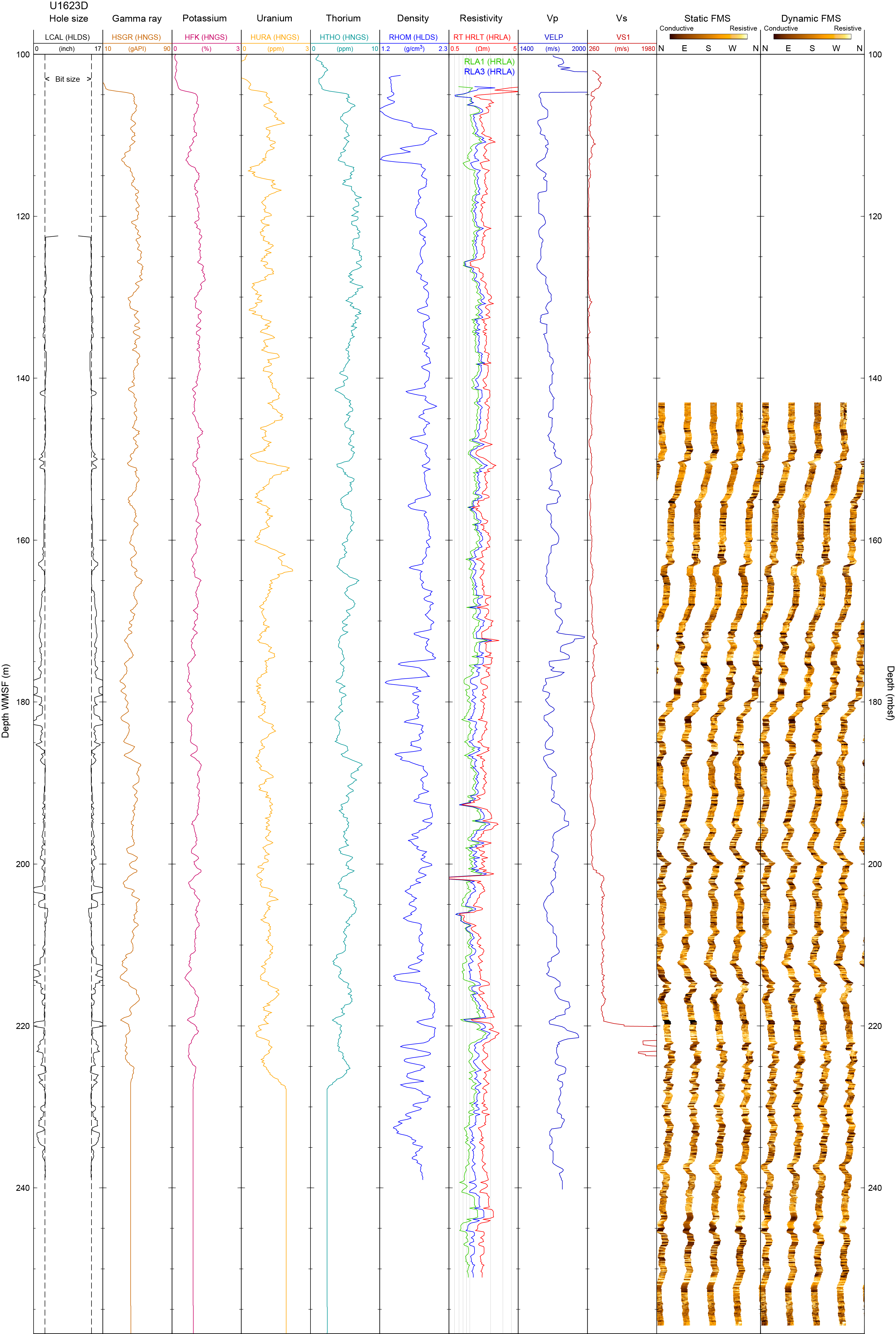 A new attempt of downhole logging was run in Hole U1623D using the triple combo and FMS-sonic strings to obtain multiple in situ property measurements. Logging operations for these tools are illustrated in Figure F82. After the BHA was set at 104 m WMSF, the string was first lowered to 260.5 m WMSF for downlog while the caliper closed. A downlog of the Hostile Environment Litho-Density Sonde (HLDS) was not obtained. Subsequently, the tool string was pulled up for the first uplog from 260.0 to 142.7 m WMSF. To increase data recovery, the strings were lowered again to 257.6 m WMSF and pulled up to 0 m WMSF for the second uplog. After the triple combo, the FMS-sonic string was lowered to 258.9 m WMSF. For the first image uplog, the FMS-sonic string was pulled up from 259.2 to 143.5 m WMSF. To increase data recovery, the tools were lowered again to 238.2 m WMSF and pulled up to 0 m WMSF for the second image uplog. The average peak-to-peak heave was estimated at 1 m. The heave compensator was utilized during the logging operation.